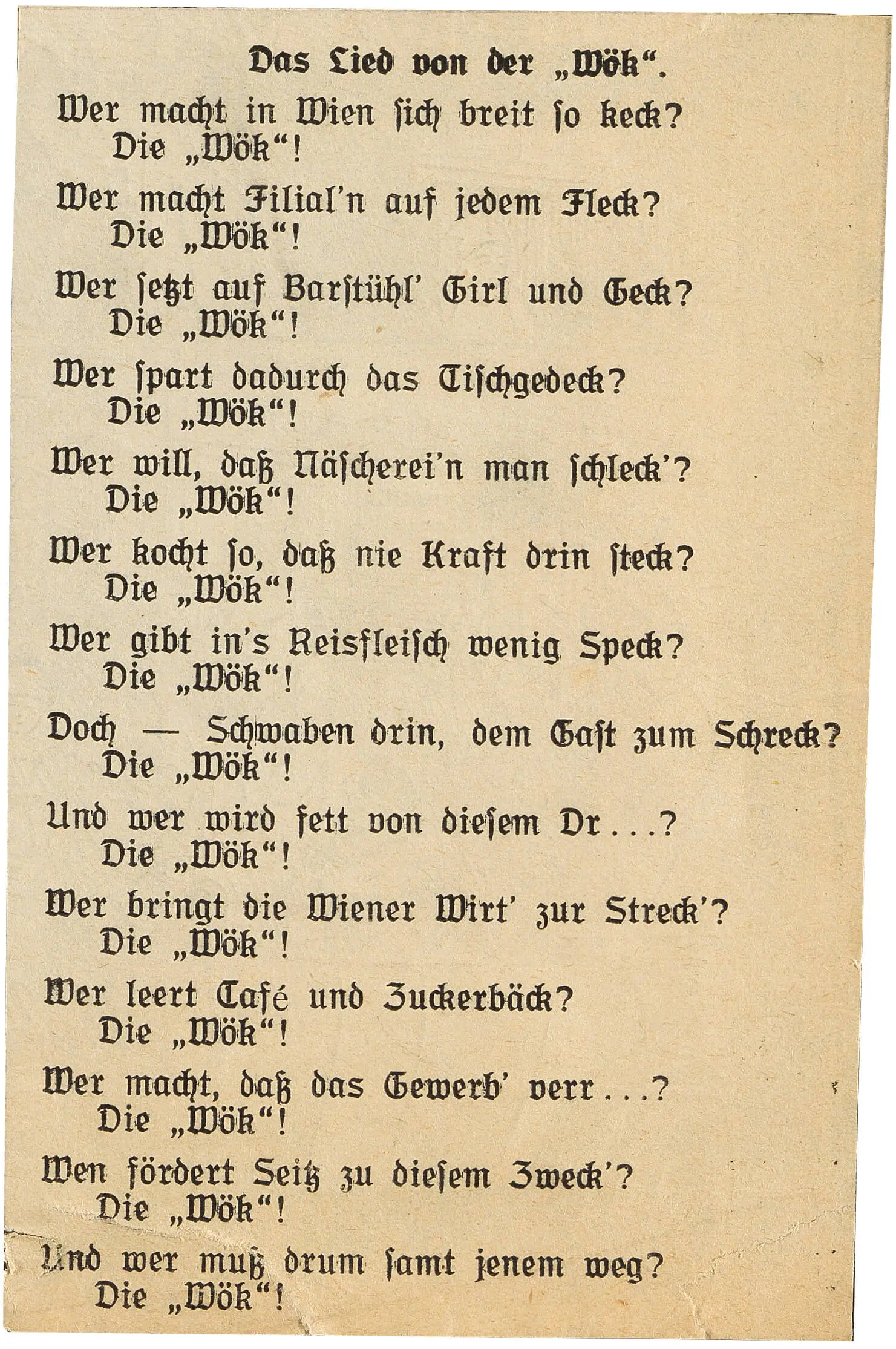 Begonnen hat alles mit dem Ersten Weltkrieg. Die prekäre Ernährungssituation führte bereits 1916 zur Einrichtung sogenannter „Kriegsküchen“ für die Versorgung bedürftiger Personen. Ein Teil dieser Küchen wurde nach dem Kriegsende, das keineswegs eine Entspannung der schlechten Versorgungslage mit sich brachte, von der Ende 1919 gegründeten Vienna Public Feeding GesmbH (kurz: VPF) übernommen. Der Zweck dieses gemeinnützigen Unternehmens bestand darin, die hungernde Wiener Bevölkerung mit warmen Speisen zu versorgen, das Stammkapital stellten je zur Hälfte der Bund (Österreichischer Staatsschatz) und die Gemeinde Wien. 1920 wurde der Firmentitel in Wiener Öffentliche Küchenbetriebsgesellschaft m.b.H. (kurz: WÖK) umgewandelt. Aufgrund der herrschenden Rationierungsmaßnahmen benötigte man für das Essen der WÖK zunächst Bezugsmarken und man musste die Speisen mit dem eigenen Geschirr abholen und mitnehmen.