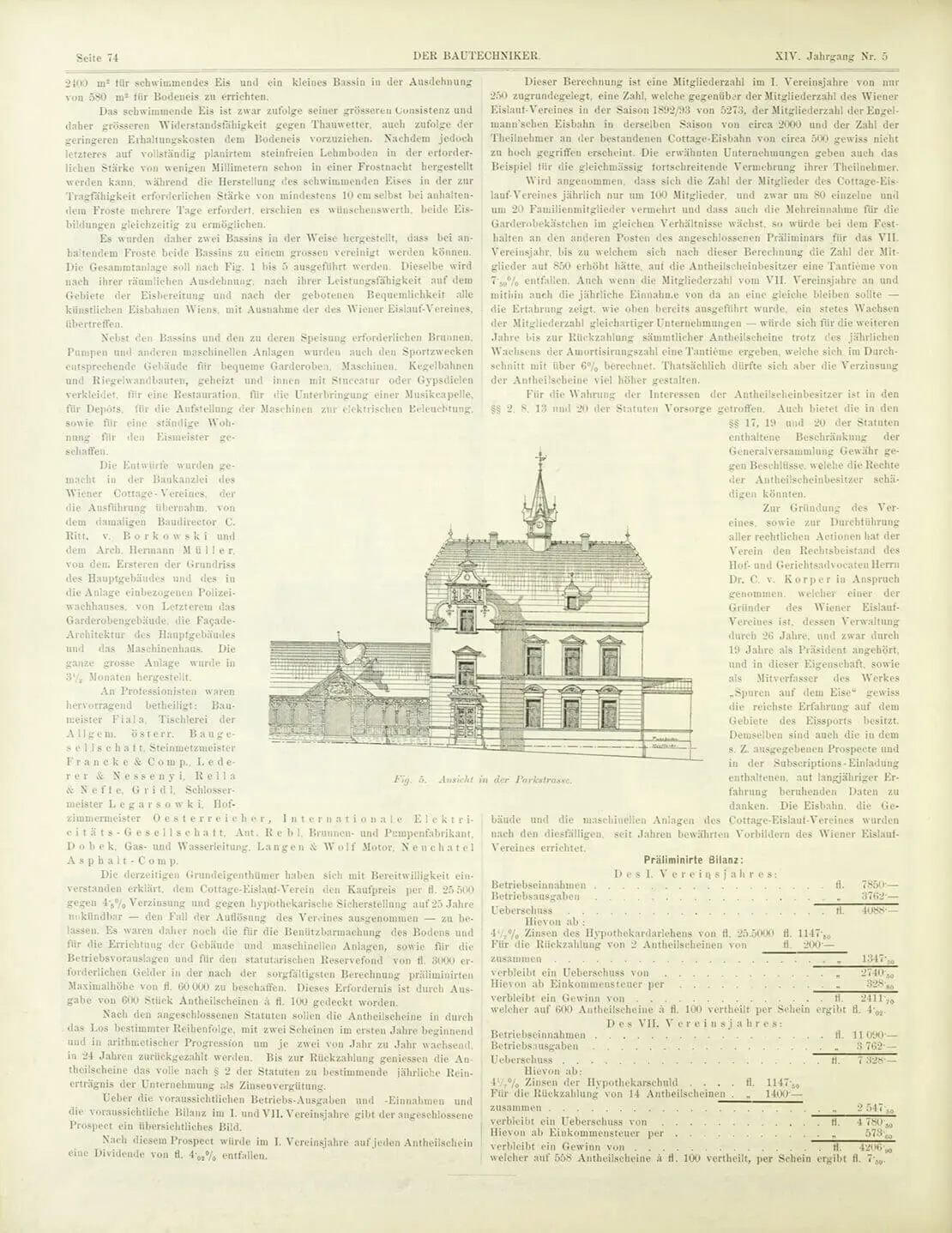 Ab 1893 war der neu gegründete Cottage-Eislaufverein an der Ecke Gymnasiumstraße / Hasenaustraße ein beliebter Treffpunkt im Cottage. Neben der Möglichkeit, dem Eislaufen als neuer Trendsportart zu frönen, bot der Verein vor allem die Chance, neue Kontakte zu schließen und nachbarschaftliche Beziehungen zu stärken. Wichtiges Zentrum war das Vereinshaus mit großzügigen Garderobenräumen, einer Restauration und einer gedeckten, elektrisch beleuchteten Kegelbahn. Für musikalische Darbietungen gab es einen eigens für Musikkapellen eingerichteten Bereich. Der Eislaufplatz selbst umfasste einen 2.400 m2 „Großen Eisplatz“ und einen 580 m2 „Kleinen Eisplatz“. Der Eislaufverein konnte aber nicht nur im Winter mit glatten Eisflächen punkten. In den eisfreien Jahreszeiten diente der Eislaufplatz dem Lawn-Tennis-Spiel und dem Radsport.