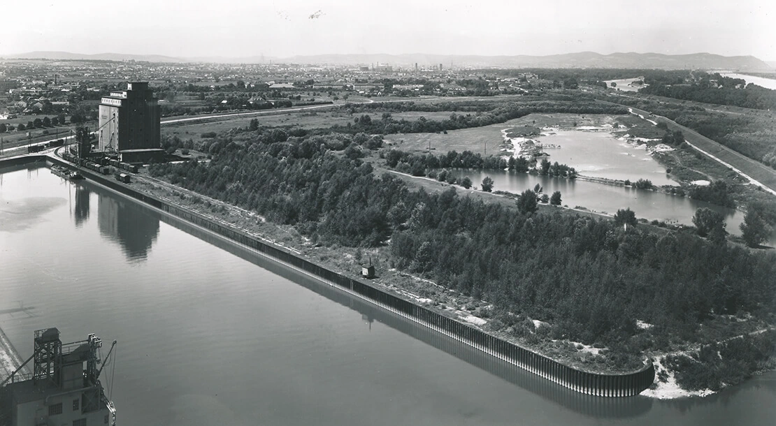 Der Verbindungskanal der Hafenbecken wurde ebenfalls begonnen, aber nicht mehr zur Gänze fertig gestellt. Das sogenannte „Blaue Wasser“ diente als Schiffswendeplatz und Wartehafen. Dessen Aushubmaterial wurde zur Schüttung der Dämme, des Kais und der Bahntrasse verwendet. Durch Selbstbegrünung konnte dadurch der Kern des heutigen Auwaldes geschaffen werden.