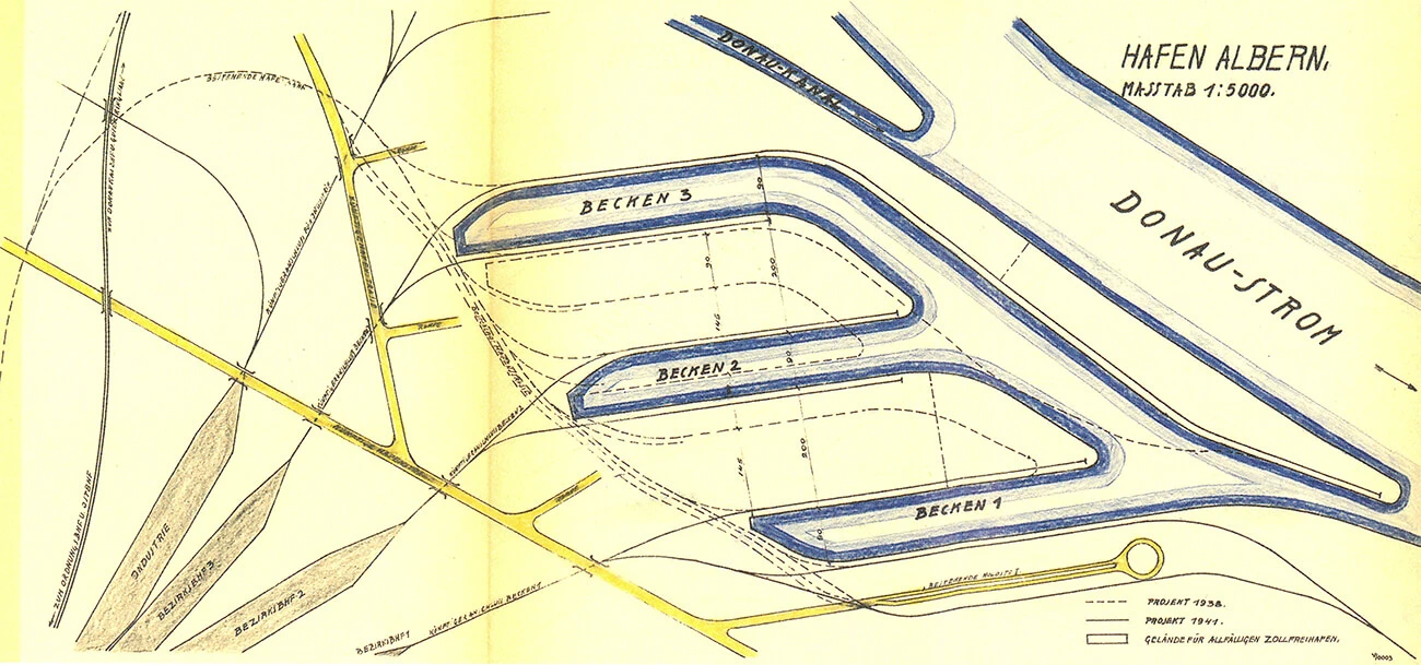 Erste Pläne des Wiener Strombauamtes sahen für den Standort Albern drei Hafenbecken vor, an denen bis zu 3 Millionen Tonnen Güter im Jahr umgeschlagen werden konnten. Für den Gütertransport waren die Errichtung eines neuen Hafenbahnhofs und eine Anschlussstelle der Reichsautobahn nach Bratislava und Budapest in Kaiserebersdorf geplant. Auch eine Groß-Mühle, nach dem architektonischen Vorbild der Plange’schen Mühle in Düsseldorf, sollte zur Aufwertung des Hafenbildes errichtet werden. Aufgrund der Abgelegenheit des Geländes sollten Wohnbauten die Ansiedlung von Arbeitern im Hafen erleichtern. Ein zweiter Plan des Strombauamtes redimensionierte das Projekt auf zwei Hafenbecken und einen Verbindungskanal, um Platz für wassergebundene Industrie zu schaffen.