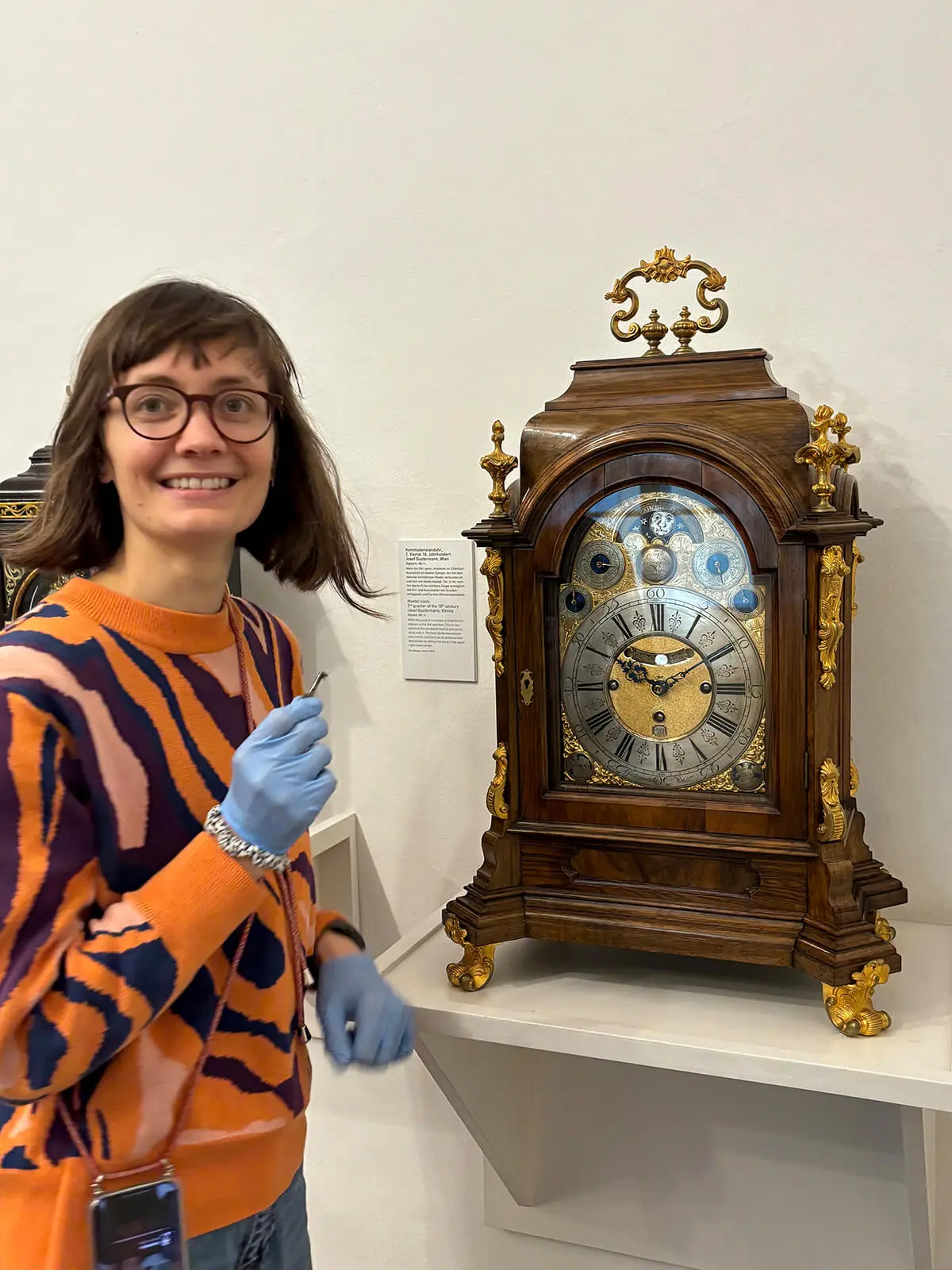Ende 2022 hatten wir vier verschiedene Erzählstränge mit leicht abweichender Objektauswahl und wir konnten uns zunächst nicht entscheiden, welche Idee wir weiter verfolgen sollten. Deswegen machten wir eine kleine Umfrage unter potenziell interessierten Spieler:innen. Am Ende gewann diese Story: Die Gruppe erbt eine Taschenuhr ihrer Großtante Selma (der Name kam erst später – uns war wichtig, einen Namen zu finden, der nicht nur auf Deutsch funktioniert, Selma lässt sich auch aus dem Arabischen, Türkischen und Bosnischen herleiten). Die fiktive Protagonistin Selma basiert lose auf der historischen Person Marie von Ebner-Eschenbach, die leidenschaftliche Sammlerin von Taschen- und Schmuckuhren sowie Uhrmacherin war und deren Uhren in der Ausstellung zu sehen sind. Selmas geliebte Taschenuhr ist gut im Uhrenmuseum versteckt und kann nur durch das Lösen kniffliger Rätsel gefunden werden – und Überraschung! Sie ist zerlegt! Wer möchte nicht gern mal eine Taschenuhr zusammenbauen?