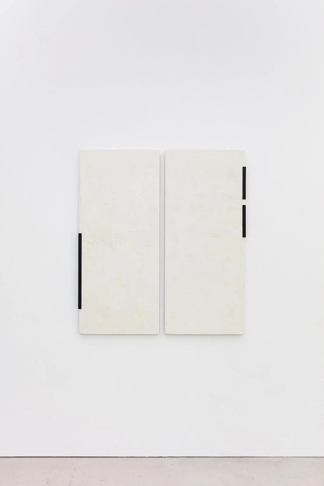 Materialität und Bildkomposition stehen bei Melanie Enders feinsinnigen Arbeiten ganz stark im Vordergrund. „Es ist für mich körperlich lustvoll mit meinen Materialien zu arbeiten und deren spezifische Charaktereigenschaften immer besser zu verstehen“, erklärt die Künstlerin. „Ich finde es spannend, dass ein Material während dem Bearbeitungsprozess ganz unterschiedliche Erscheinungsformen annehmen kann.“ So werden Gipskartonplatten mit einem feuchten Schwamm abgerieben, Papierschichten dadurch schichtweise abgetragen, bis der Gipskern freigelegt ist und sich die Oberfläche dieses Materials völlig verändert. Spuren des manuellen Prozesses – Kratzspuren, Abschabungen und Papierreste – bleiben im Gips sichtbar und definieren die Oberfläche der so langsam aus ihrer Ummantelung geschälten skulpturalen Objekte.