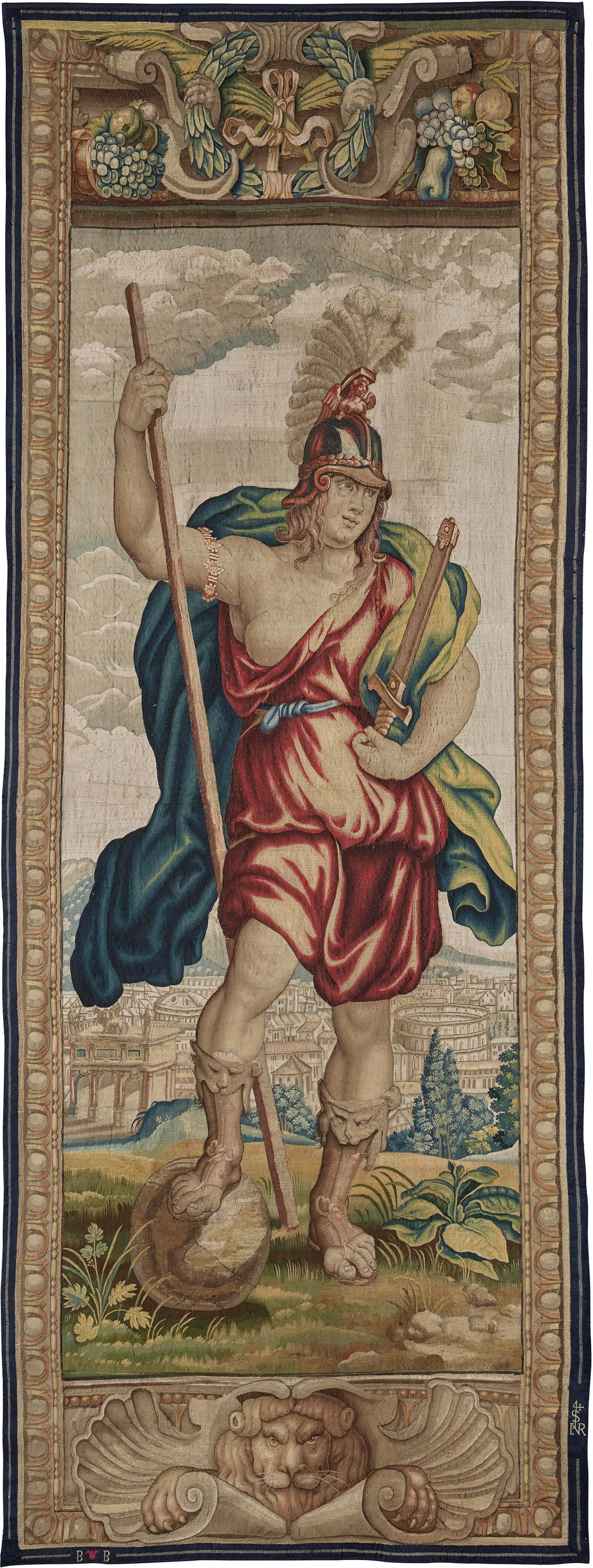 Der Vertrag vom 9. November 1616, in dem Jan Raes und der Genueser Kaufmann Francesco Cattaneo vereinbarten, den Decius-Mus-Wandteppichzyklus zu wirken, bezieht sich nicht nur auf die Hauptstücke, sondern auch auf drei solcher schmalen Behänge (der dritte stellt ein „Trophäum“ dar, wofür in der Antike ein Baumstamm mit Rüstungsteilen und Waffen der Feinde behängt wurde). Diese sind nicht direkt Teil der erzählerischen Handlung, sondern liefern eine kommentierende Anmerkung. Somit sieht man die beiden weiblichen Personifikationen heute als Lobpreisung der Heldentat des Konsuls und nicht als allgemeinen Hinweis auf ein triumphierendes Rom. Tatsächlich deuten verschiedene Darstellungen von Rubens und seinen Vorgängern darauf hin, dass hier nicht die Göttin Roma, sondern die Figur der Virtus, der Verkörperung militärischer Tugend, dargestellt wird. Zusammen bezeichnen die Figuren von Victoria und Virtus die beiden Eigenschaften, die die Tat von Decius Mus prägen: Es war die römische Tugend dieses Mannes, die Rom den Sieg bescherte.
