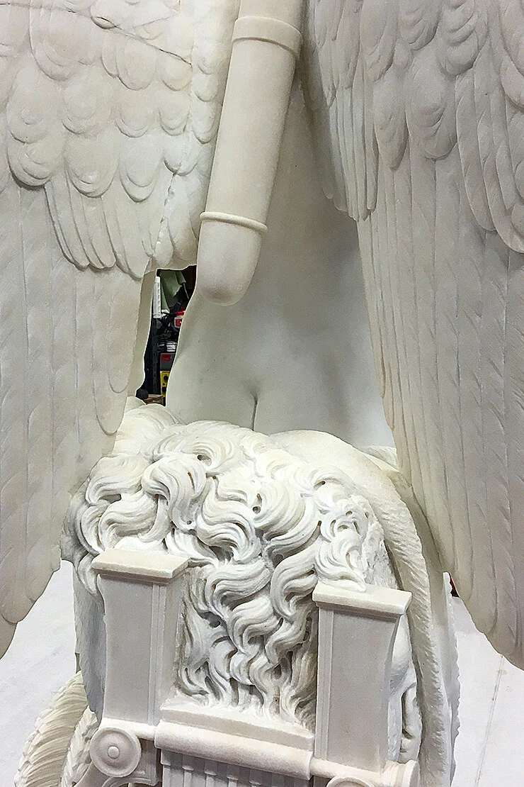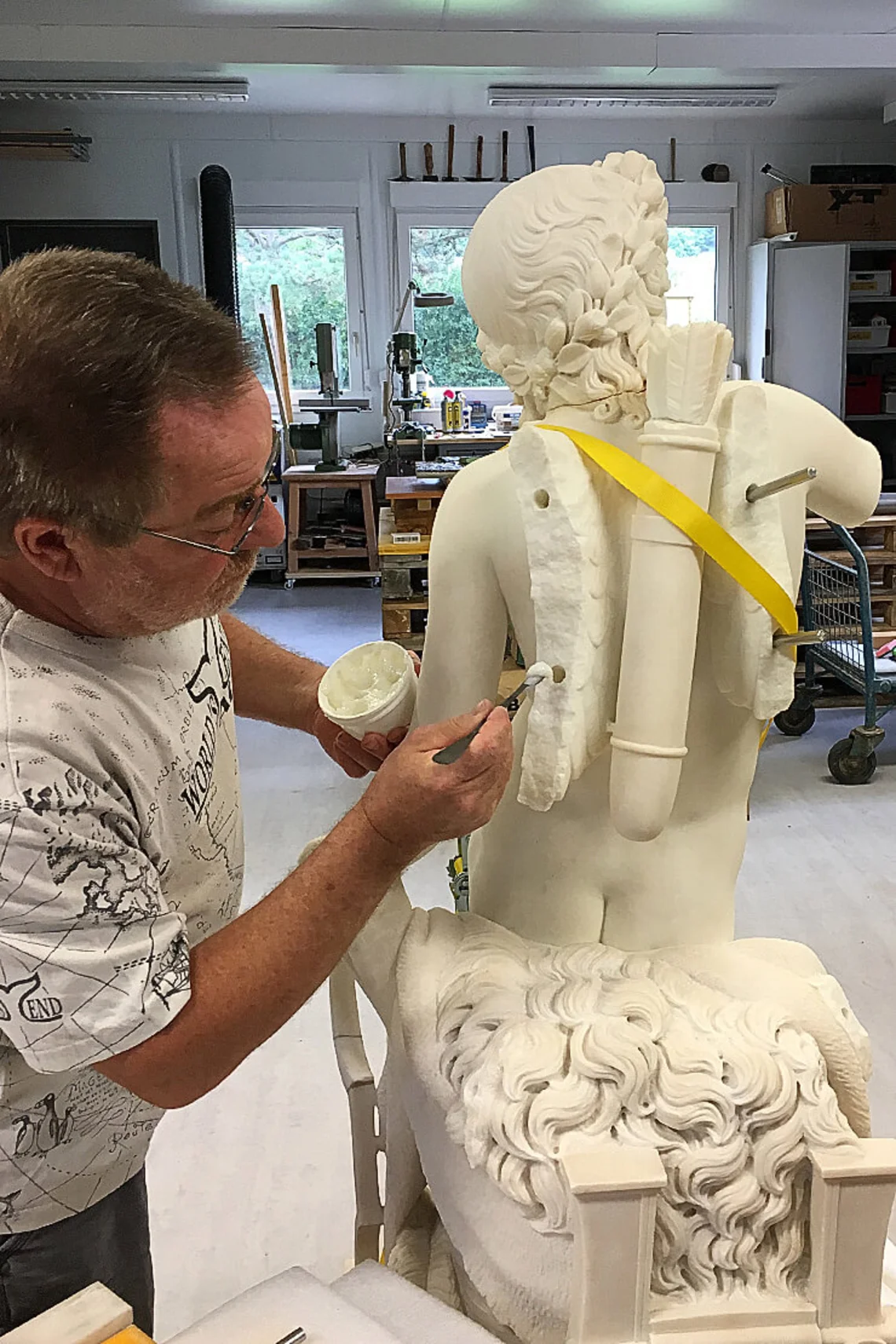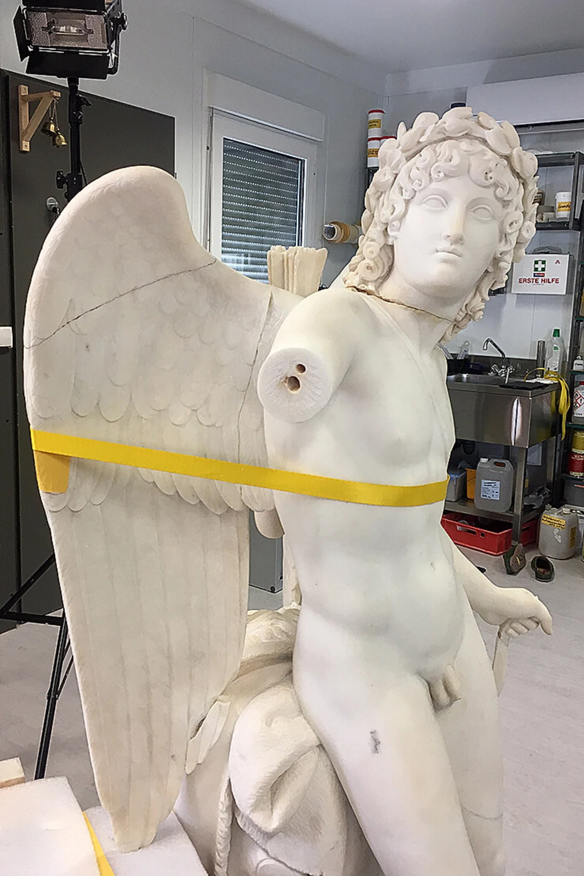 Glücklicher Weise stehen für restauratorische Zwecke heute eine Vielzahl an geeigneten Materialien und Methoden zur Verfügung. Mit Mikrodampfstrahl, organischen Lösemitteln und feinstem Bimsmehl konnte absolut substanzschonend die Brillanz des weißen Marmors wieder zurückgewonnen werden. Alterungs- und UV-beständige Kunstharze erlauben äußerst präzise Verklebungen, und korrosionsbeständige Armierungen aus Glasfaserstäben und Niro-Stahl gewährleisten zusätzliche Stabilität. Die ursprüngliche künstlerische Intention konnte damit wiederhergestellt werden, der offene Bruch am Hals erinnert an den schweren Sturz des geflügelten Gottes vor nunmehr fast 200 Jahren. Mit der Präsentation in Mailand hat dieses fast vergessene Meisterwerk aus der Sammlung des Wien Museums nun endlich die verdiente Aufmerksamkeit erhalten.