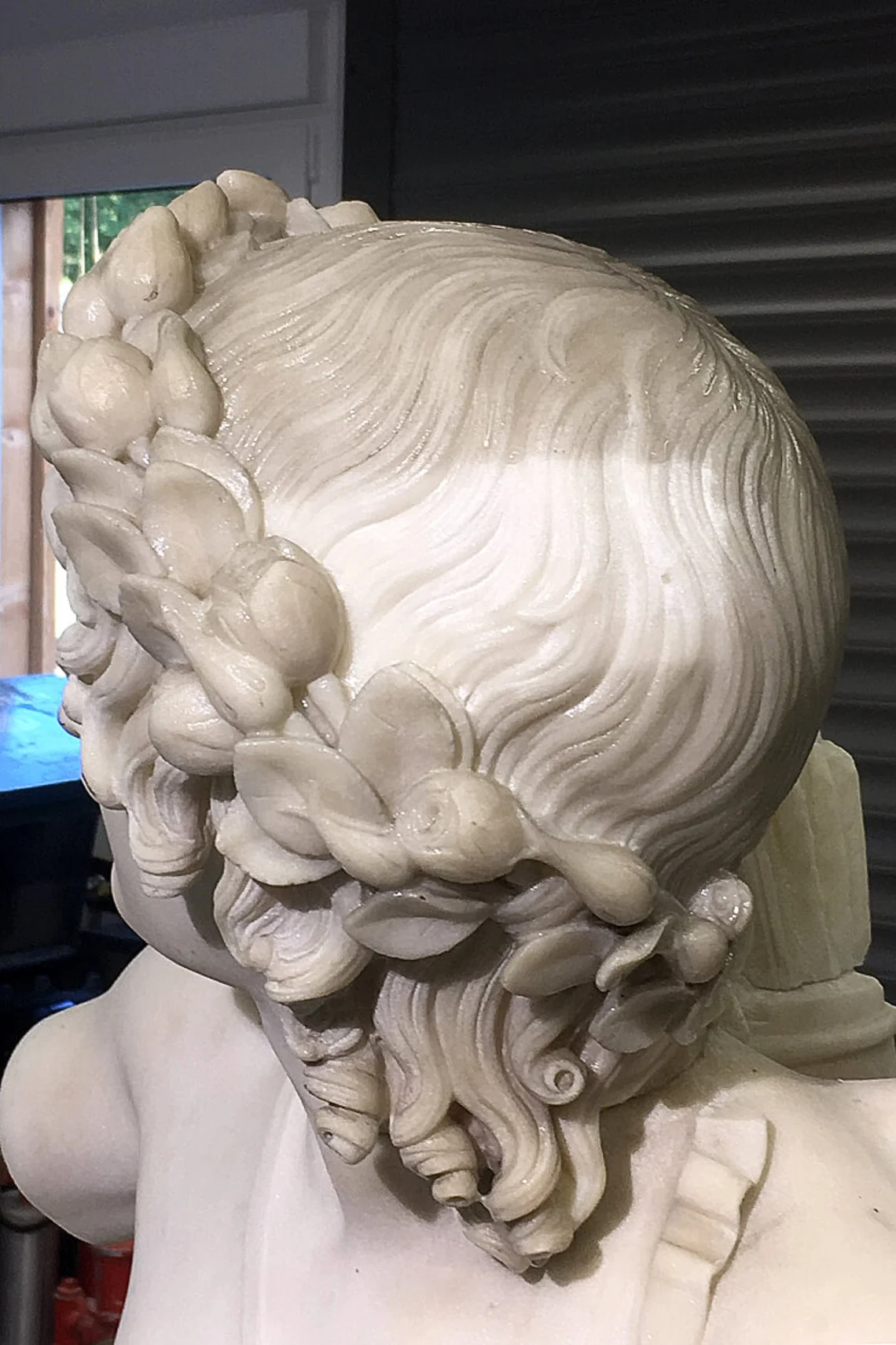 Hier blieb die Statue, bis sie im Frühjahr 2019 in das Atelier des Steinrestaurators Christian Gurtner gebracht wurde. Die Schäden waren gravierend: Neben der kaum vermeidbaren Verschmutzung unter nicht musealen Bedingungen hatte der eine oder andere Bürger das Bedürfnis, sich auf der Marmoroberfläche mit diversem Schreibzeug zu verewigen. Auch die zuvor beschriebenen Reparaturen aus der Entstehungszeit des Kunstwerks hielten der widrigen Aufstellungssituation nicht stand: die historischen Verklebungen der Brüche mit damals durchaus üblichen Gipsmassen und eisernen Armierungen hatten sich gelockert und waren über die Jahre schon mehrmals unsachgemäß und ästhetisch unbefriedigend repariert worden.