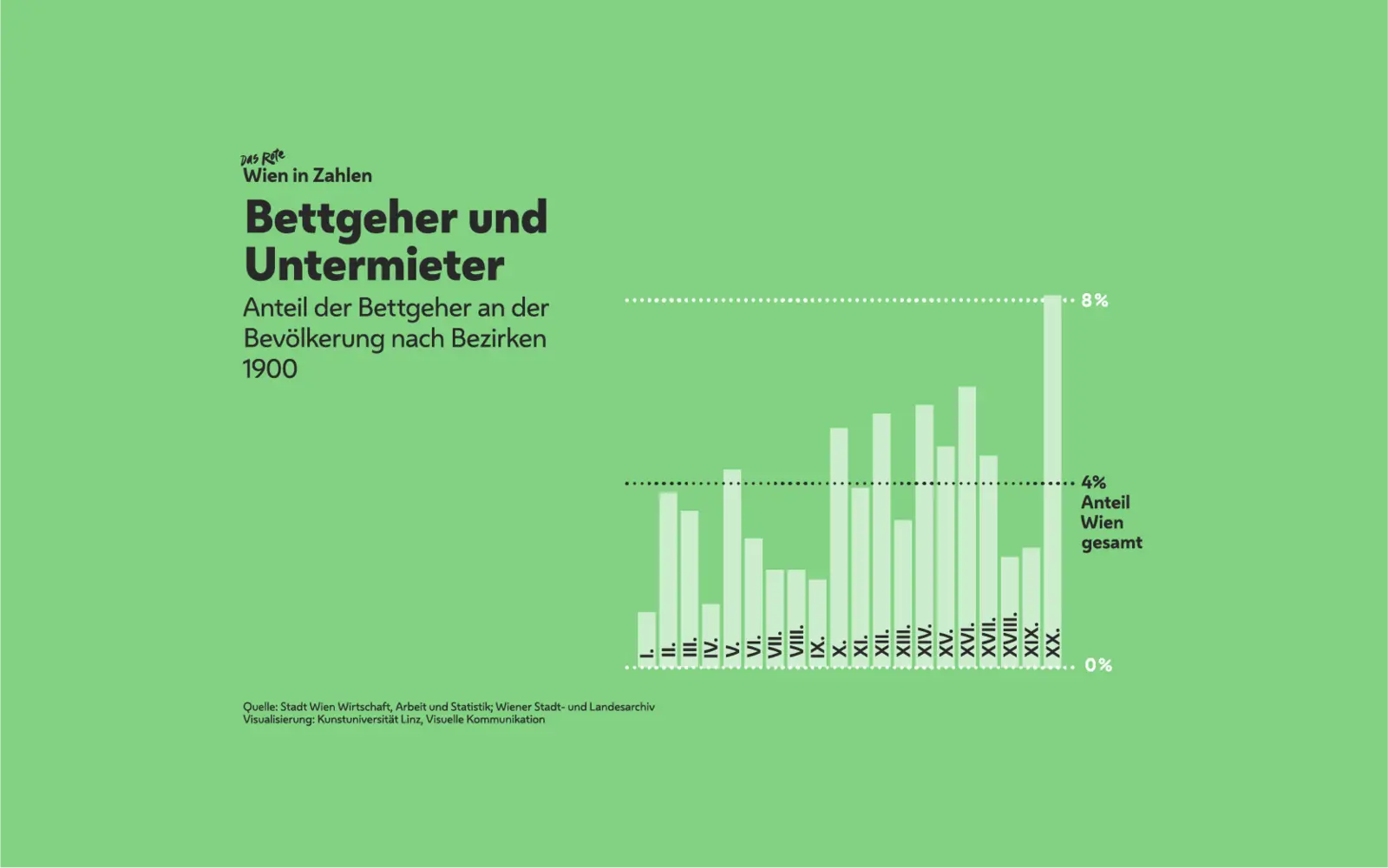 Eine große Zahl der nach Wien ziehenden Industriearbeiter musste sich am freien Markt um einen Wohnplatz kümmern. Da sie sich jedoch vielfach keine eigene Unterkunft leisten konnten, blieb vielen nur, sich bei Fremden zum Schlafen einzumieten: Sogenannte Bettgeher bezahlten für eine Schlafstelle in einer gemieteten Wohnung. Dabei wurden die Betten sowohl am Tag als auch in der Nacht stundenweise vermietet – je nach Arbeitsschicht der einzelnen Personen.