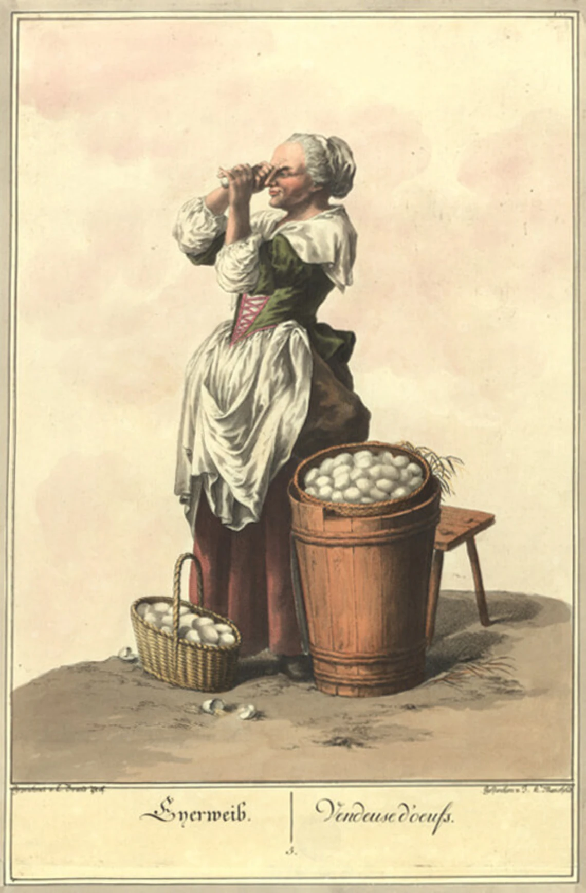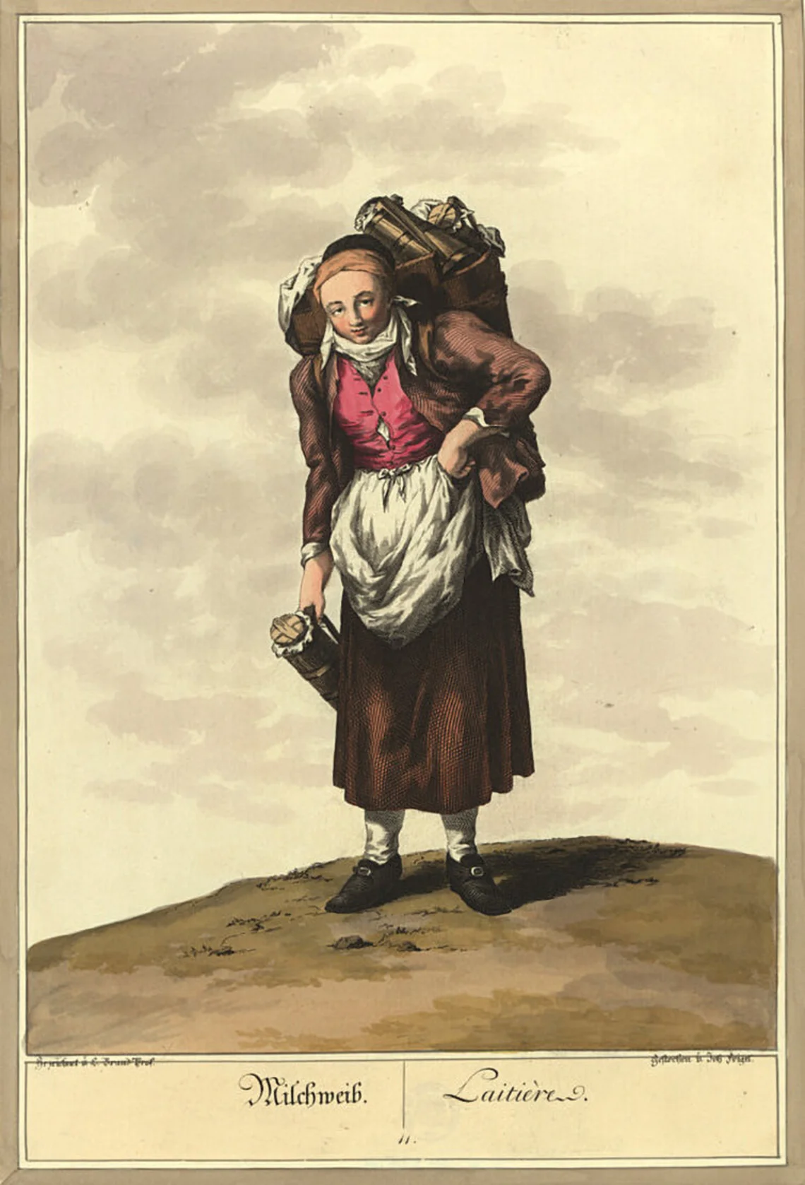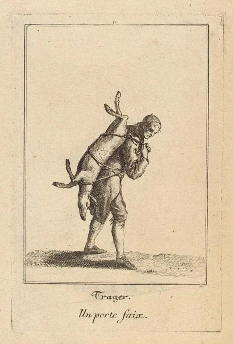 In der Sammlung des Wien Museums gibt es unzählige Darstellungen von Dienstleistungen und Gewerben, die mit Tragen und Schleppen in vergangen Jahrhunderten zu tun haben: Darstellungen von Wanderhändlern und Handwerkern, die bepackt mit Waren und Werkzeug KundInnen suchen, Darstellungen von Marktfrauen, die mit Gemüsekörben zum Markt ziehen, Darstellungen von Trägerinnen mit Wasserschaffeln am Kopf oder Kohleträgern, die schwere Säcke mit Kohle schultern, Darstellungen von Sesselträgern. Meist handelt es sich um idealisierte Zeichnungen und Gemälde, die wenig von den tatsächlichen Anstrengungen, die mit diesen Tätigkeiten verbunden waren, erzählen. Auch der „Foodora“-Rucksack erzählt erst auf den zweiten Blick von den körperlichen Anstrengungen, die mit diesem Job verbunden sind: dem Schleppen, dem stressigen Navigieren durch den dichten Stadtverkehr, den durchschnittlich 80 bis 120 Kilometern Wegstrecke, die ein Fahrradbote laut Benjamin Herr pro Tag bei jedem Wetter zurücklegt.