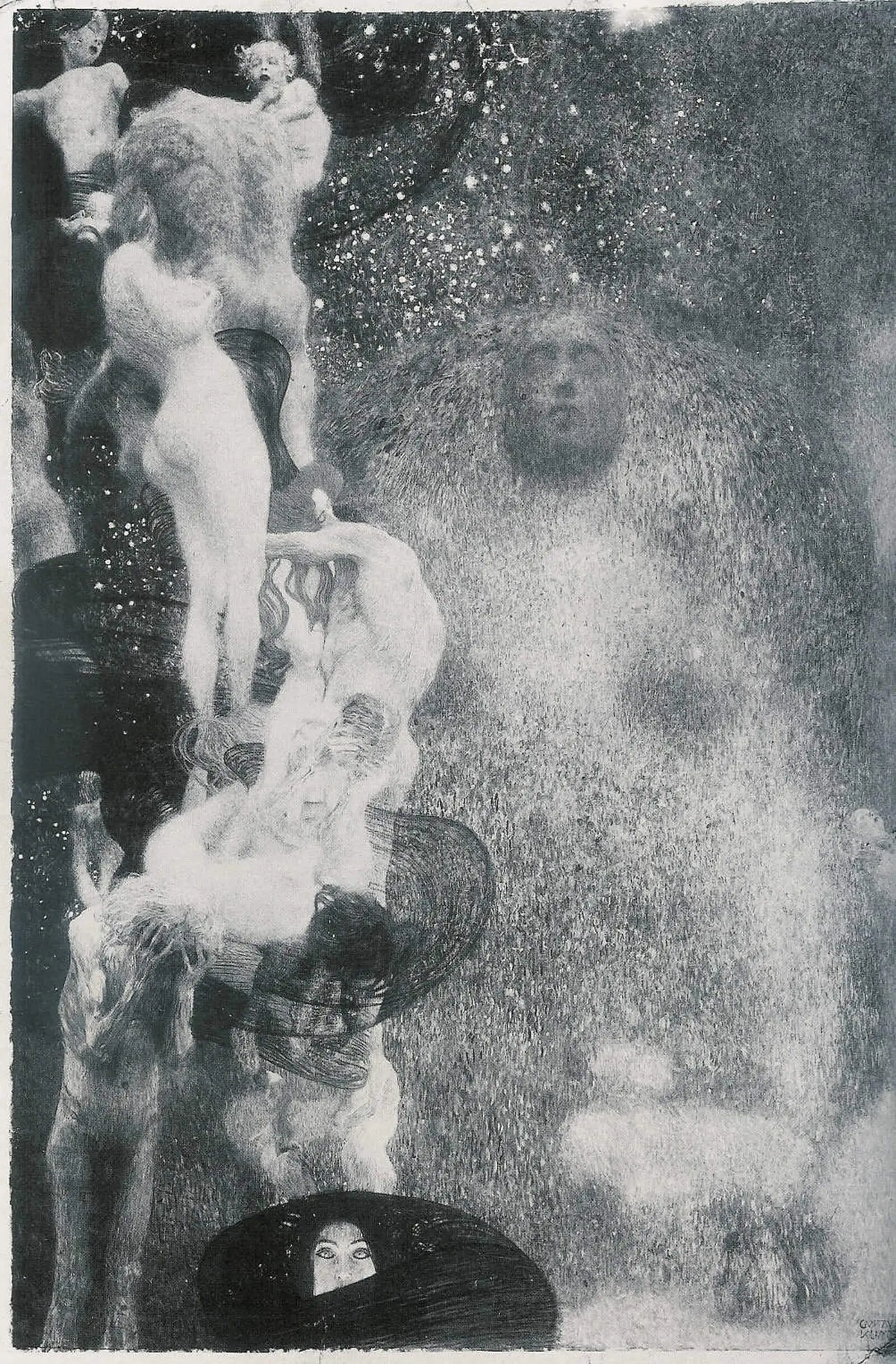 Die Idee einer Synergie aller Gattungen sollte um Max Klingers Beethoven Monument in der XIV. Secessionsausstellung (April–Juni 1902): Beethovenausstellung verwirklicht werden. Klimts bahnbrechendes, geometrisierendes, flächenbezogenes Monumentalwerk, der Beethovenfries (1901) befand sich im linken Seitensaal. Obwohl er das eigentliche Thema, die Visualisierung der 9. Sinfonie im Gegensatz zu Klingers figuralem Klassizismus auf eine vollkommen neue und moderne Weise umgesetzt hatte, löste vor allem seine Interpretation der Feindlichen Gewalten als drastisch überzeichnete weibliche Aktfiguren, einen Sturm der Entrüstung aus. Das Groteske in Beardsleys Grafik war von Klimt in das monumentale Format und seine epische Erzählweise übertragen worden.