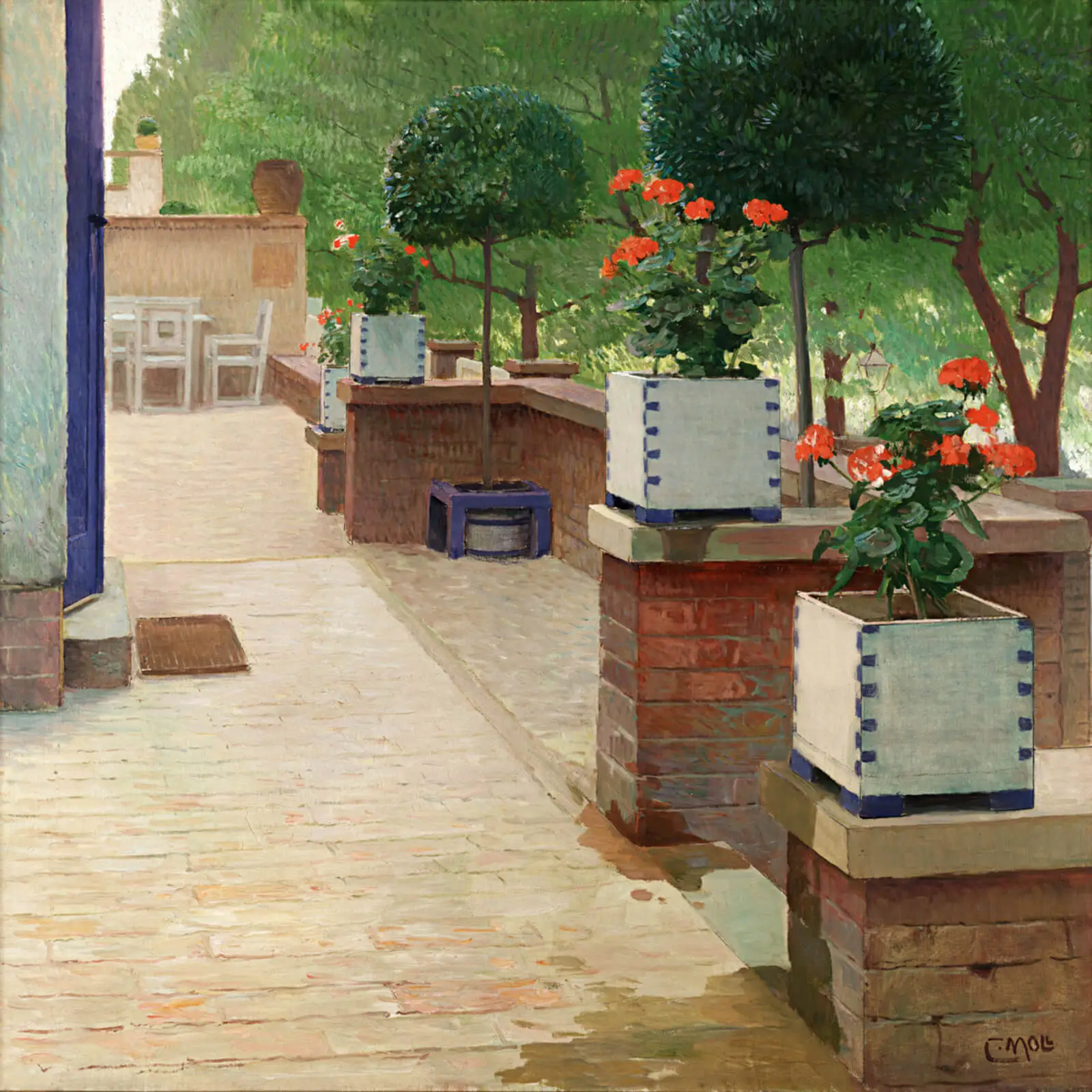 Klimt und Moll reagierten in ihrer Malerei auf die Idee der modernen Reformgärten. Während Klimt Blumen mit Damenporträts assoziierte (Die Sonnenblume, 1907), verwendete Moll wie Monet die Blüten als leuchtende Farbakzente und räumliche Koordinaten im Bild (Terrasse der Villa auf der Hohen Warte, 1903).