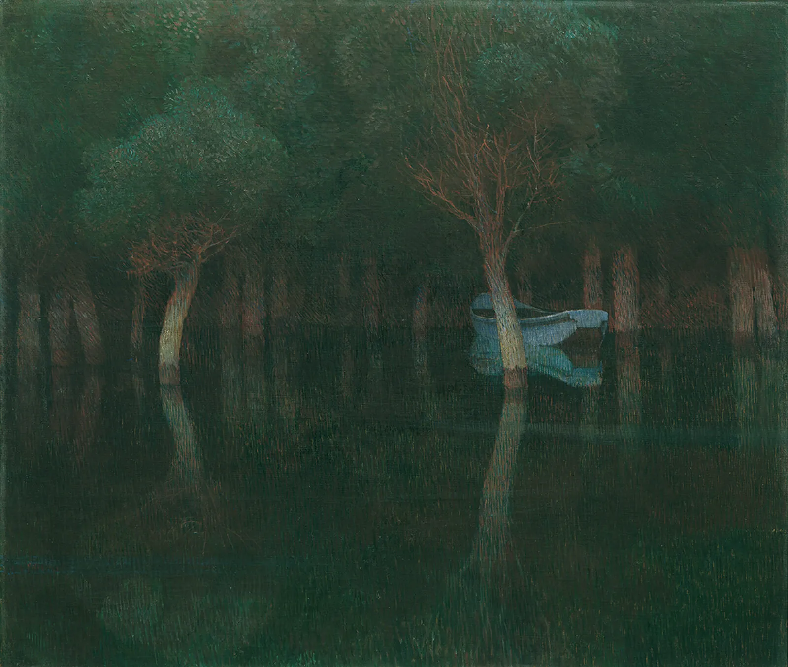 In Molls Natur- und Lichtstudie, welche sich mit der reduzierten Farbsicht vor Eintreten der Dunkelheit auseinandersetzte, interpretierte er die transparente, von kaum sichtbaren Nebelschwaden überzogene Wasseroberfläche, welche ein ambivalentes und zugleich profundes Spiegelbild zeigt, als ein sekundäres Seherlebnis aus der Sphäre des Unbewussten. Im Publikationsjahr von Freuds Traumdeutung gemalt, erscheinen Assoziationen mit dem Fluss Lethe und dem Kahn Charons naheliegend, der im Gemälde Hirémy-Hirschls als winzige Szene im Hintergrund erscheint, und bei Moll zum zentralen Motiv wurde, ohne die mythologische Figur Charons darzustellen. Molls Bild Vor dem Diner befand sich unter den Kunstwerken der Secession bei Weltausstellung 1900 in Paris, wo Klimts Philosophie mit dem Grand Prix ausgezeichnet wurde.