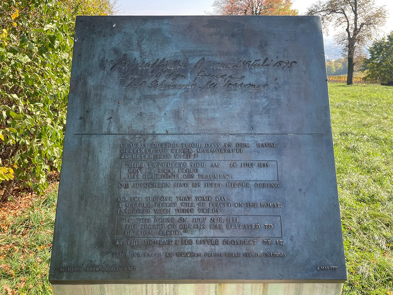Das Schloss Bellevue zählt somit zu jenen geschichtsträchtigen Plätzen, an denen ein denkwürdiges Ereignis stattfand, das an einem konkreten Datum festzumachen ist. Fünf Jahre später, am 12. Juni 1900, nachdem sein Hauptwerk Die Traumdeutung bereits erschienen war, wandte sich Freud in einem Brief mit jener Frage an seinen Freund Wilhelm Fließ, die nun auf besagtem Gedenksteins verewigt ist: „Glaubst Du eigentlich, dass dereinst an diesem Hause zu lesen sein wird, hier enthüllte sich am 24. Juli 1895 dem Dr. Sigm. Freud das Geheimnis des Traumes? Die Aussichten sind bis jetzt hierfür gering.“