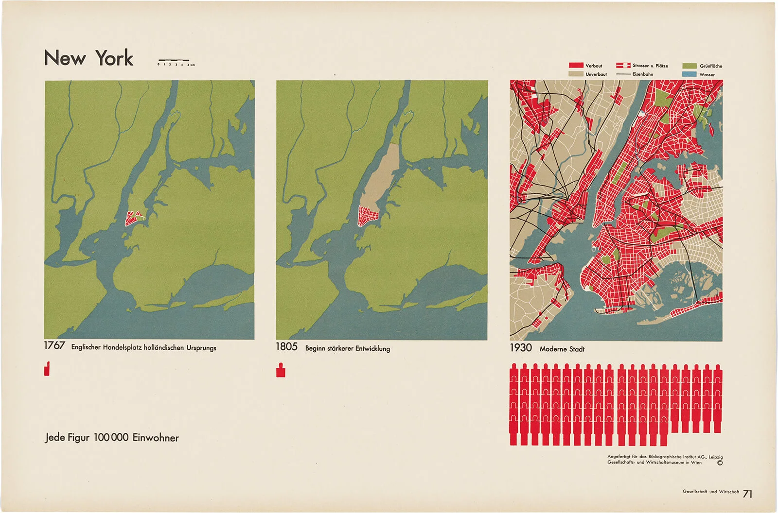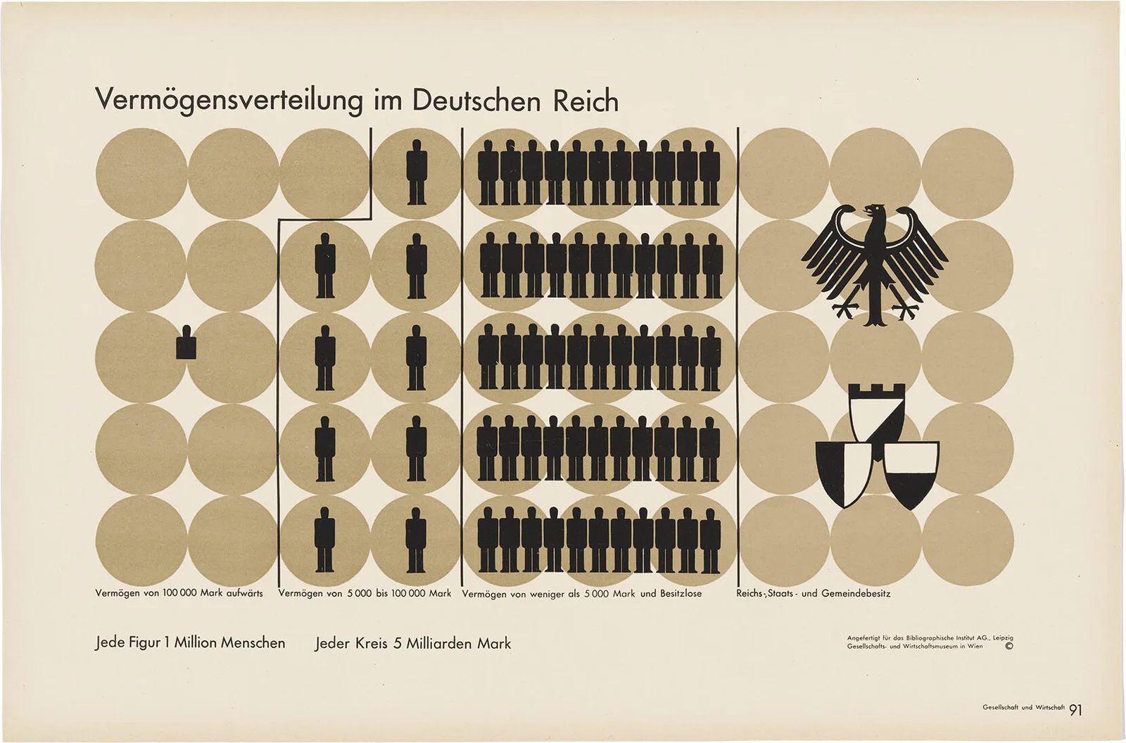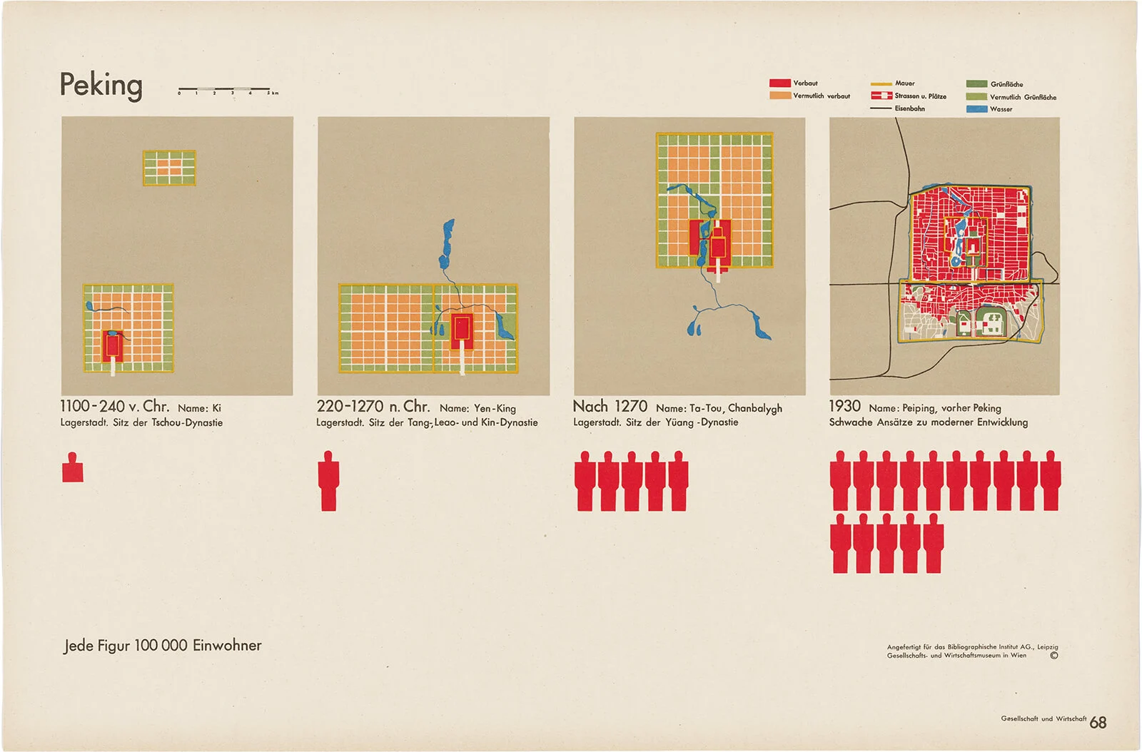 Neurath war sich der Schwierigkeiten bewusst, diesen „gewaltigen Plan“ umzusetzen. Zumindest in zweidimensionaler Form kam er diesem einige Jahre später aber durchaus nahe: und zwar mit dem 1930 vom Museum herausgegebenen Mappenwerk „Gesellschaft und Wirtschaft. Bildstatistisches Elementarwerk“. 100 hochwertig ausgeführte bildstatistische Tafeln führen durch mehrere tausend Jahre Menschheitsgeschichte rund um den Globus, von den Hochkulturen Mesopotamiens, zur Stadtentwicklung Pekings oder New Yorks, vom Wien im Barock bis zu den aktuellen Themen der Zeit um 1930, zu globaler Erdölproduktion, Arbeitslosigkeit oder Streikbewegungen. In einer Auswahl von hundert Tafeln wird so die Geschichte der Menschheit und der Welt erzählt. Tatsächlich ein gewagtes und „gewaltiges“ Vorhaben!