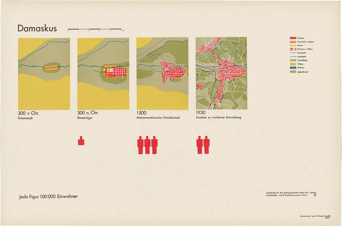 Stadtentwicklung von Damaskus, Peking und New York im Laufe der Jahrhunderte, im Mappenwerk Gesellschaft und Wirtschaft. Bildstatistisches Elementarwerk“, um 1930, Fotos: TimTom/Wien Museum, Inv.-Nr. 123996/68, 69, 70