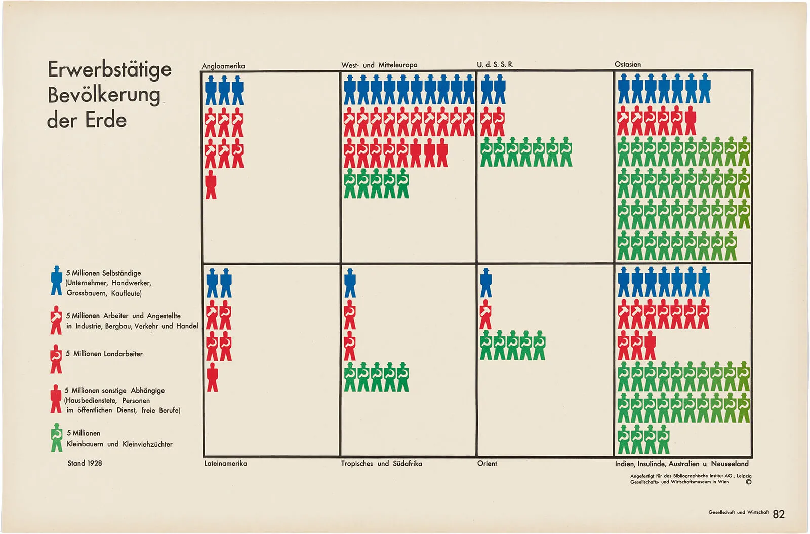 Man zeigte etwa, um den Anstieg der Autoproduktion zu vermitteln, nicht mehr unterschiedlich große, sondern unterschiedlich viele Autos. Mit der Darstellung der Menge (nicht der Größe) war von der Genauigkeit abgesehen ein zentrales erkenntnistheoretisches Prinzip verbunden. Man sollte neben zeitlichen und räumlichen Unterschieden die schiere Menge erkennen und so die Betrachter:innen dazu motivieren, weiterzudenken und die damit verbundene Komplexität zu erkennen. Wenn ich viele Autos statt einem großen Auto sehe, leitet mich dazu, auch viele Menschen zu sehen, die diese Autos herstellen, viele Maschinen, viele Schiffe, die diese transportieren und so weiter. Das zweite Prinzip bestand darin, jedes Element immer mit demselben Zeichen darzustellen. Für die große Ausstrahlung, die die Piktogramme und Bildstatistiken des GWM bis in die Gegenwart besitzen, war vor allem auch das Engagement von Künstlern wie Gerd Arntz verantwortlich. Für die große Ausstrahlung, die die Piktogramme und Bildstatistiken des GWM bis in die Gegenwart besitzen, war vor allem auch das Engagement der „Transformatorin“ Marie Reidemeister (später Neurath) und des Künstlers Gerd Arntz aus der Gruppe der Kölner Progressiven verantwortlich. Reisemeister transformierte das Datenmaterial in Bildstatistiken, Arntz führte diese künstlerisch aus. In Anerkennung ihrer Arbeit vergibt die Arbeiterkammer Wien in diesem Jahr erstmals den Marie Neurath Preis für Datenvisualisierung. Generell wurde Teamarbeit im Museum großgeschrieben.