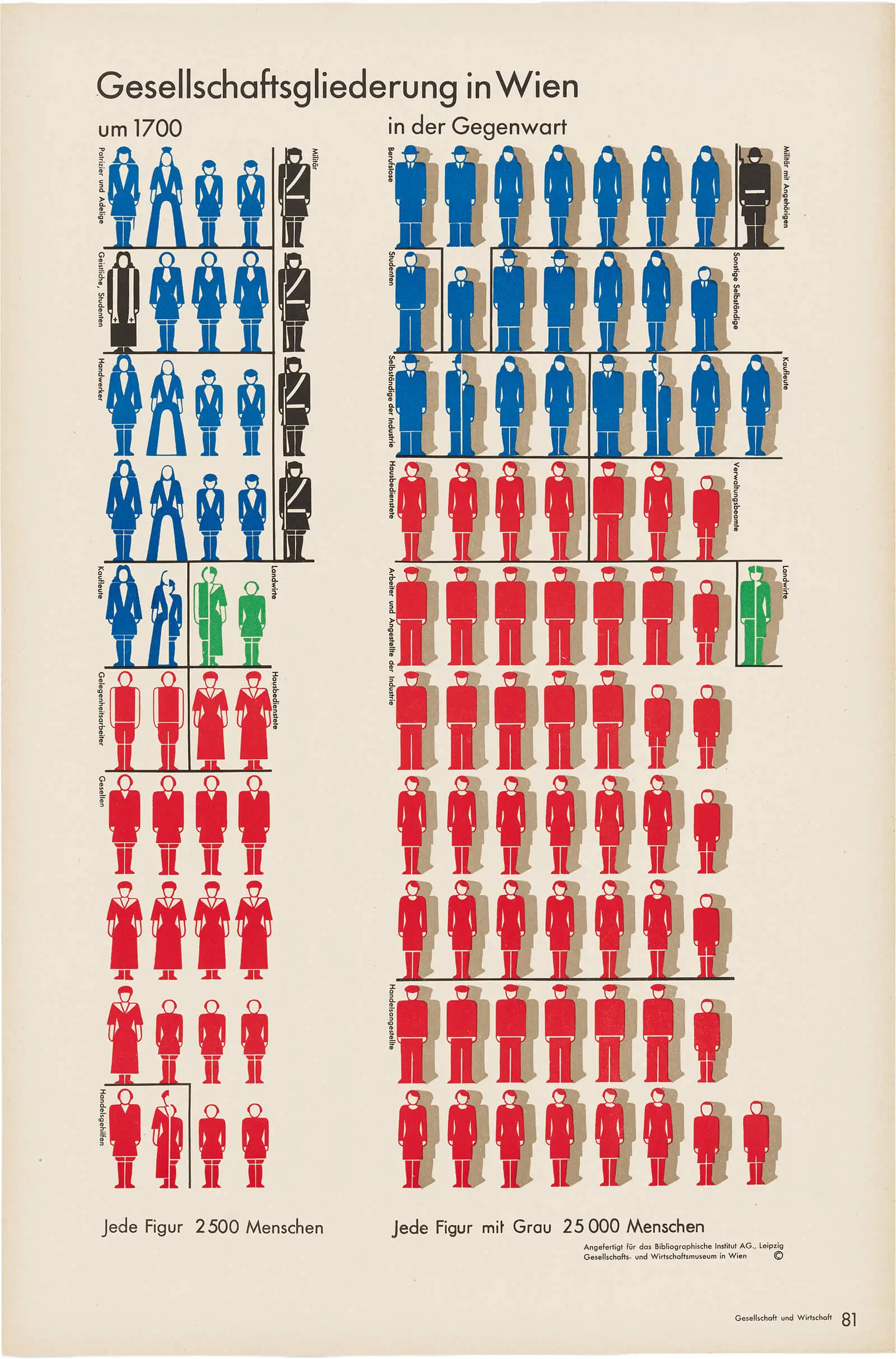 Auch in dieser Beziehung waren die Sozialmuseen nicht unbedeutend. Die Frage, wie statistische Daten visuell vermittelt werden können, geht im Prinzip weit bis in das 18. Jahrhundert, in die Zeit der Aufklärung und der Anfänge des modernen Staates zurück. Die Sozialmuseen des ausgehenden 19. Jahrhunderts experimentierten mit verschiedenen Methoden, veranschaulichten sehr plastisch etwa Preissteigerungen und Inflation mit unterschiedlich großen Brotlaiben oder Fleischstücken. Hier setzte die Innovation der Wiener Methode der Bildstatistik an, indem Mengen als Mengen und nicht als Größen dargestellt wurden.