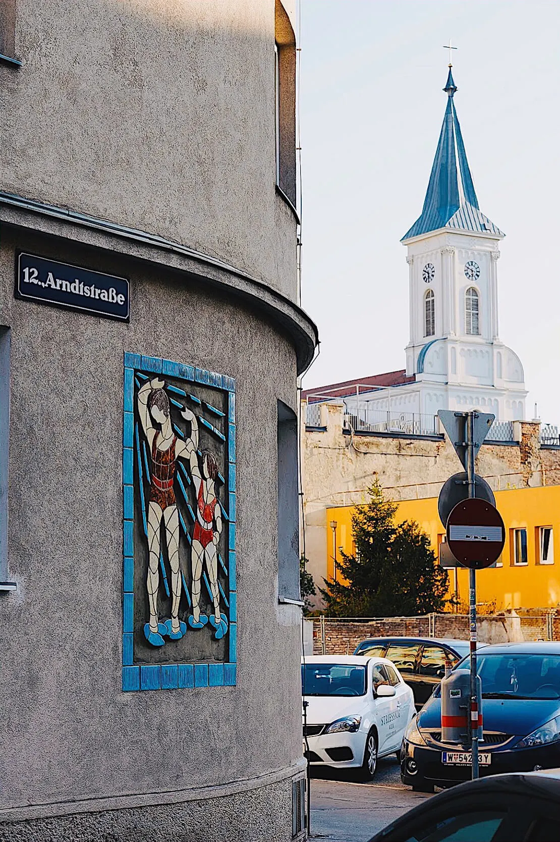 Dafür bietet Instagram das ideale Format und ermöglicht den schnellen Austausch - Social Media im besten Sinn. Wer Abwechslung sucht, findet hier Anregungen für neue Spaziergänge durch die Stadt. In der Praxis funktioniert das so: jemand sieht ein Wandbild, fotografiert es, postet und tagged es mit @raufschaumuseum. Das MdH teilt die Einsendungen mit kurzen Kommentaren in seiner Story und ordnet sie dem jeweiligen Bezirk in den Highlights zu. Die zweite Ebene der Vermittlung ist die Präsentation einzelner Werke in Form von dreier-Serien im Feed. Sauber nachfotografiert und mit einer kurzen Geschichte zu KünstlerIn oder Gebäude. Für die Auswahl sprechen sie sich ab – unterschiedliche Techniken (Reliefs, Sgraffitos und Mosaike) sind genauso ein Kriterium wie verschiedene Bezirke, Zeitepochen oder der aktuelle Tagesbezug. Wichtig ist den beiden, die Kunstwerke aus verschiedenen Perspektiven zu zeigen, und wie sie im städtischen Kontext zu sehen sind.