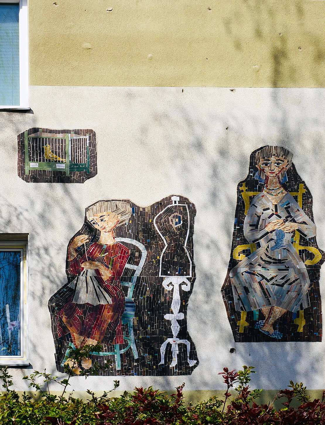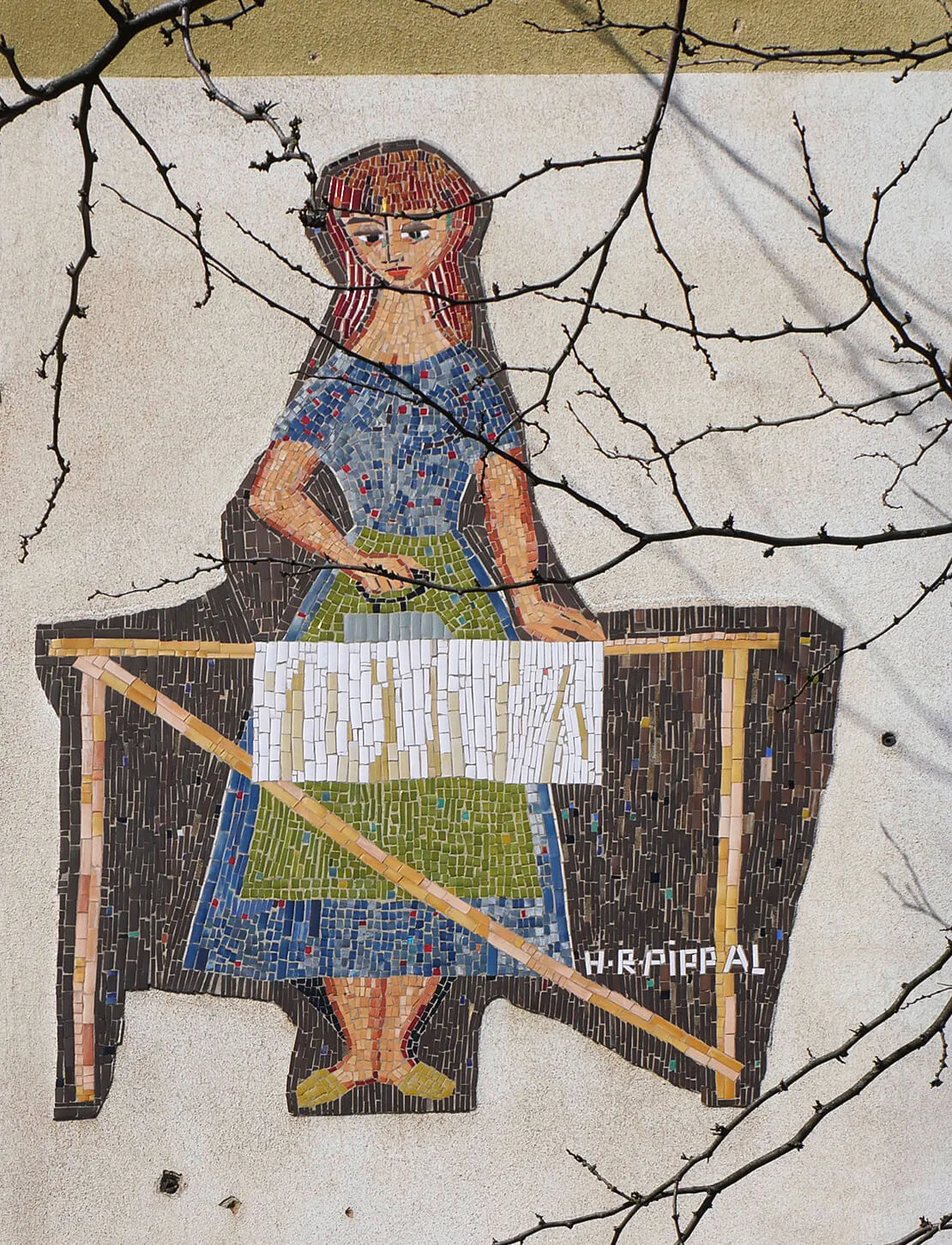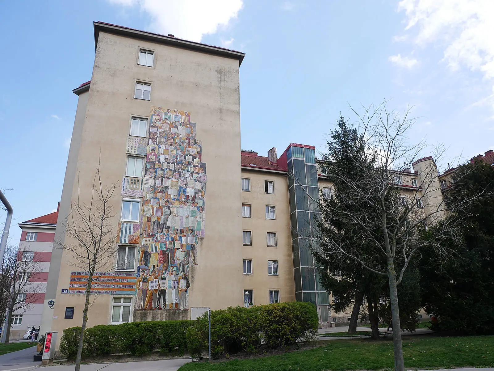 Auch nach dem Zweiten Weltkrieg bilden die Wände das damalige Selbstverständnis der Gesellschaft ab, allerdings konzilianter im Sinne des Wiederaufbaus. Otto Rudolf Schatz feiert in dem überdimensionalen Mosaik „100.000 neue Gemeindewohnungen“ (1957) die kommunalen Sozialleistungen, wobei die Wohnbauten des Roten Wien mitgezählt wurden. Zu finden ist es am Stadtrand, im Franz-Novy-Hof, fernab jeder Repräsentation. Mit der Kunst in den Wohnanlagen wurde eine Denkmalskultur des Privaten geschaffen, schreibt Irene Nierhaus. Die Architekturhistorikerin nennt es „die Formung der öffentlich relevanten Privatsphäre“. Die Themen sind oft sehr konkret mit den Vorstellungen und Aufgaben von Wohnen verbunden. Aus der Zeit heraus schlüssig, aus heutiger Sicht mitunter irritierend. Beispielsweise die „Frauenberufe“ von Hans R. Pippal am Flötzersteig, wo Frauen ausschließlich beim Bügeln oder Kochen dargestellt werden.