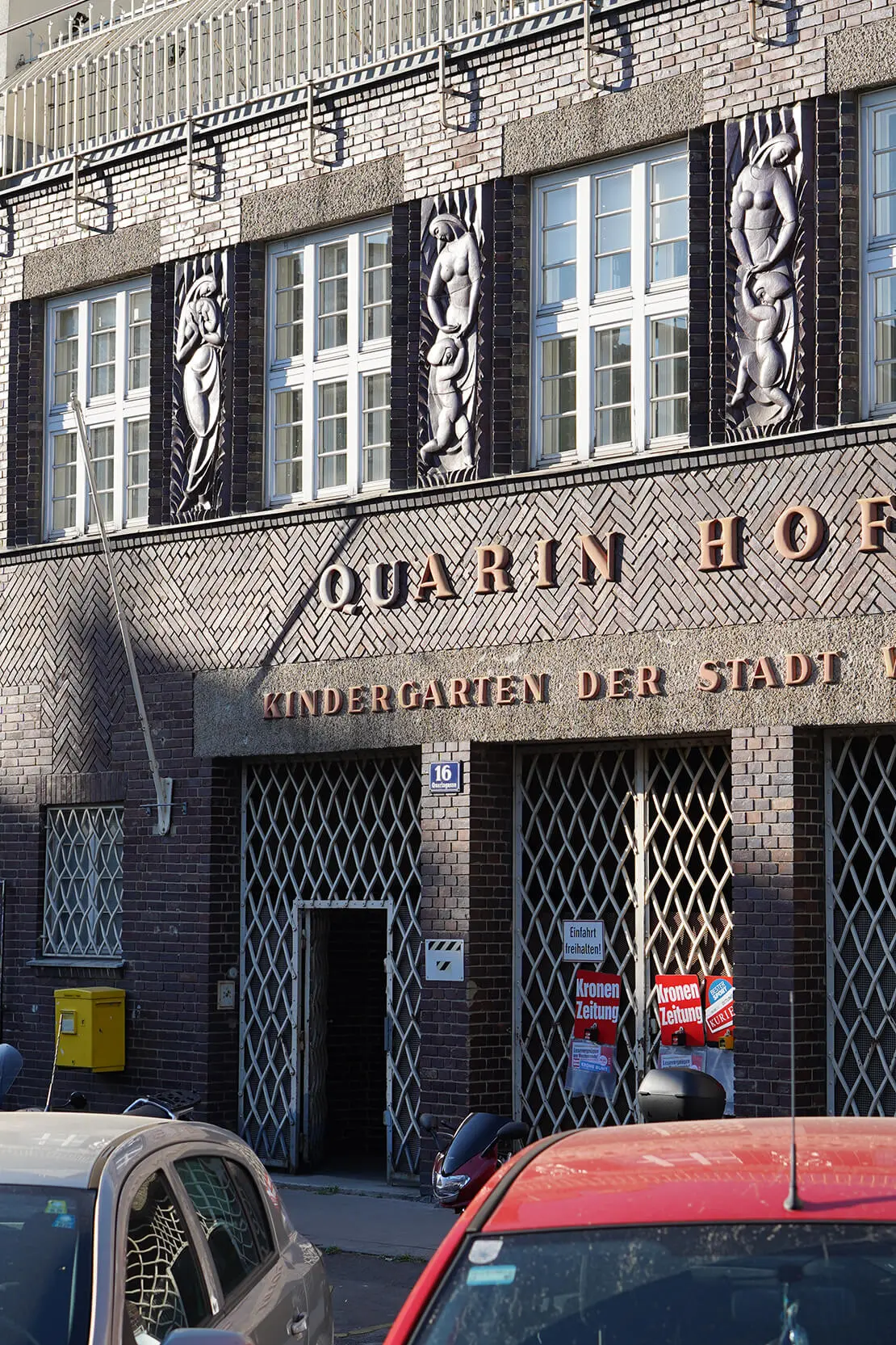 Die monumentalen Allegorien in den Gemeindebauten bis 1934 zeugen von der Zuversicht, eine neue Gesellschaft aufzubauen. So weisen im Quarinhof vier Frauenreliefs von Ferdinand Opitz am zentral gelegenen Kindergarten auf den hohen Stellenwert der Kinder hin. Während im Roten Wien die Arbeiter in heroischen Reliefs dominierten, brachte der Ständestaat eine Rückbesinnung auf idyllische Folklore.