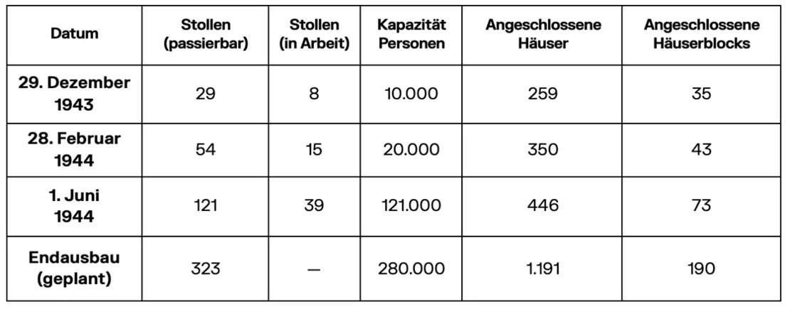Auf Grundlage der Arbeit hunderter Zwangsarbeiter:innen nahm das Schutzraumnetz bald Form an. Ende Februar 1944 war der Fluchtweg vom Stephansplatz zum Morzinplatz notdürftig benützbar – zwei Wochen darauf sollten die Strecken zwischen Salzgries und Volksgarten sowie sechs Wochen später die Abschnitte zwischen Freyung und Burggarten sowie Hohem Markt und Wallnerstraße zu passieren sein. Dabei handelte es sich um die grobe Herstellung der Verbindungen, der vollständige Ausbau folgte erst später. Aus der Tabelle geht das Anwachsen des Schutzraumnetzes im Laufe der Monate hervor:
