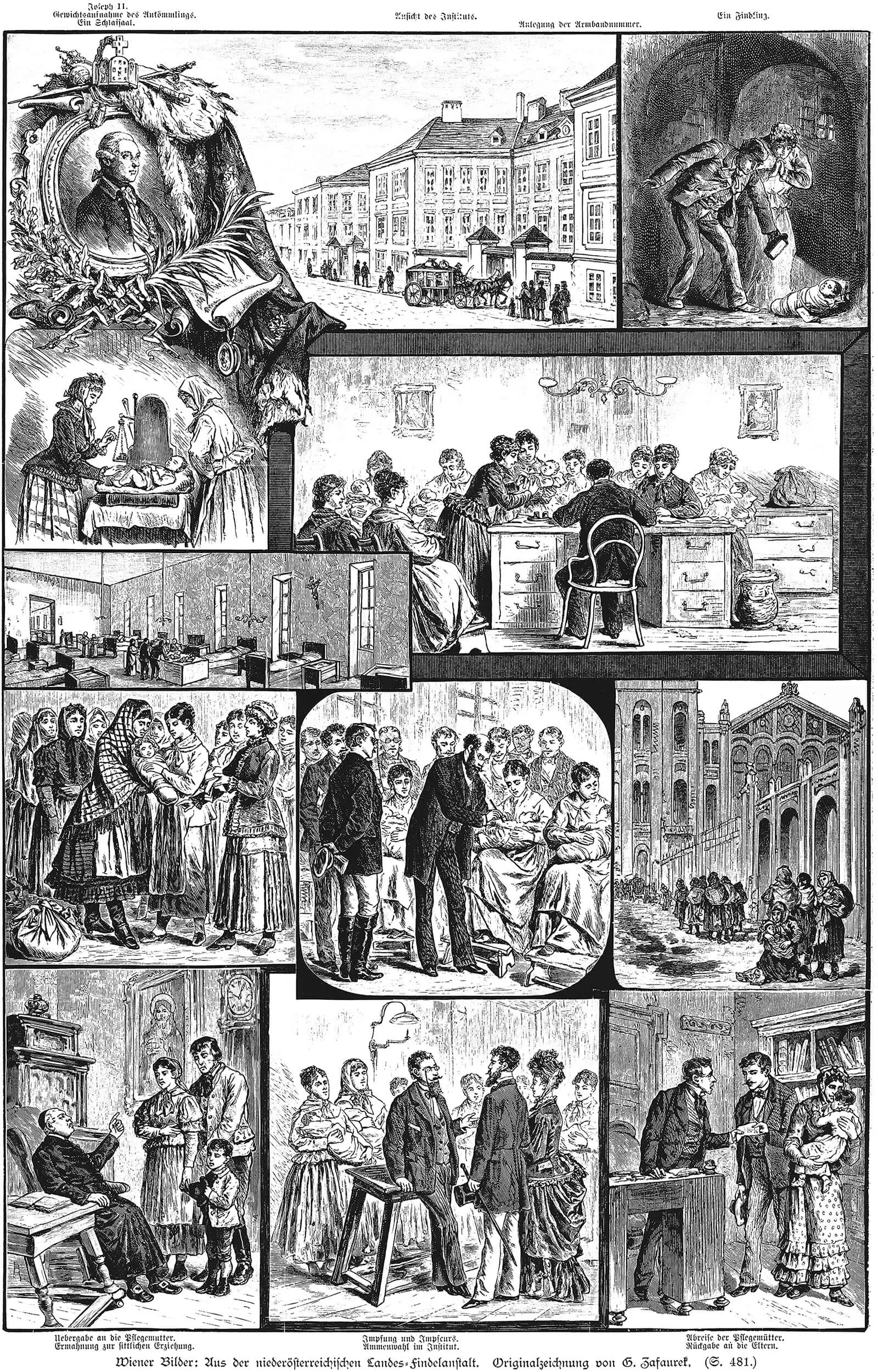 Befürworter*innen hoben hingegen den fürsorglich-karitativen Charakter der Anstalt hervor. Dieser wird auch in der Bildfolge Wiener Bilder: Aus der Niederösterreichischen Landes-Findelanstalt des Wiener Vedutenmalers Gustav Zafaurek (1841-1908) betont. Die 1886 in der Illustrirten Zeitung veröffentliche Druckgrafik präsentiert ein Idealbild einer reibungslos funktionierenden Fürsorgeeinrichtung. Zwölf zusammenhängende – jeweils mit Bildtitel versehene – Einzelbilder erzählen die unwahrscheinliche Erfolgsgeschichte eines auf der Straße gefundenen Kindes: Von seiner Abgabe in der Anstalt und der dortigen Versorgung, der liebevollen Übernahme durch Pflegeeltern, bis zu seiner Rückkehr zu den biologischen Eltern. Durch eine historische Kontextualisierung lassen sich der informative Gehalt über die Funktionsweise der Fürsorgeeinrichtung von erfundenen oder lückenhaften Elementen dieser Darstellung unterscheiden.