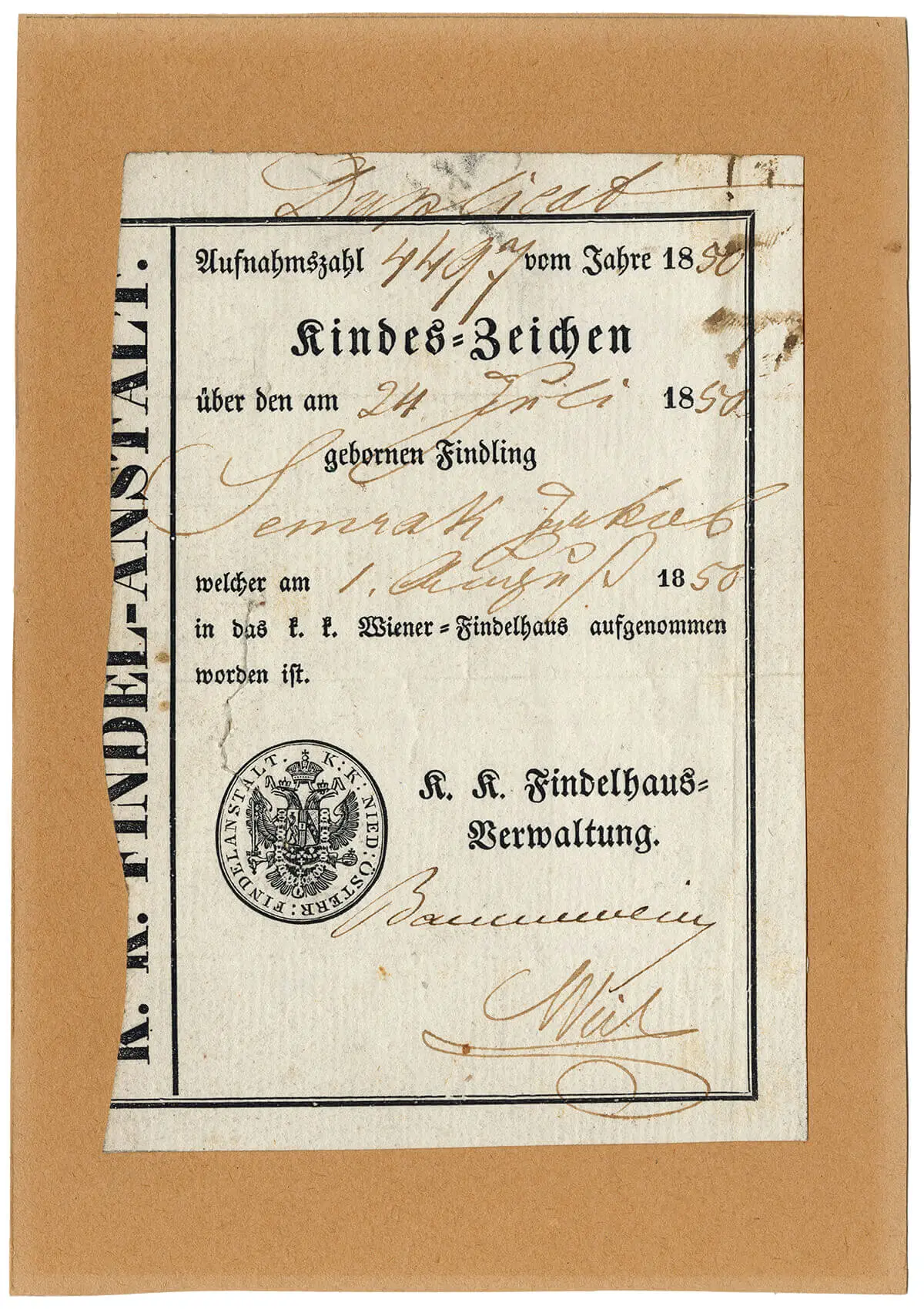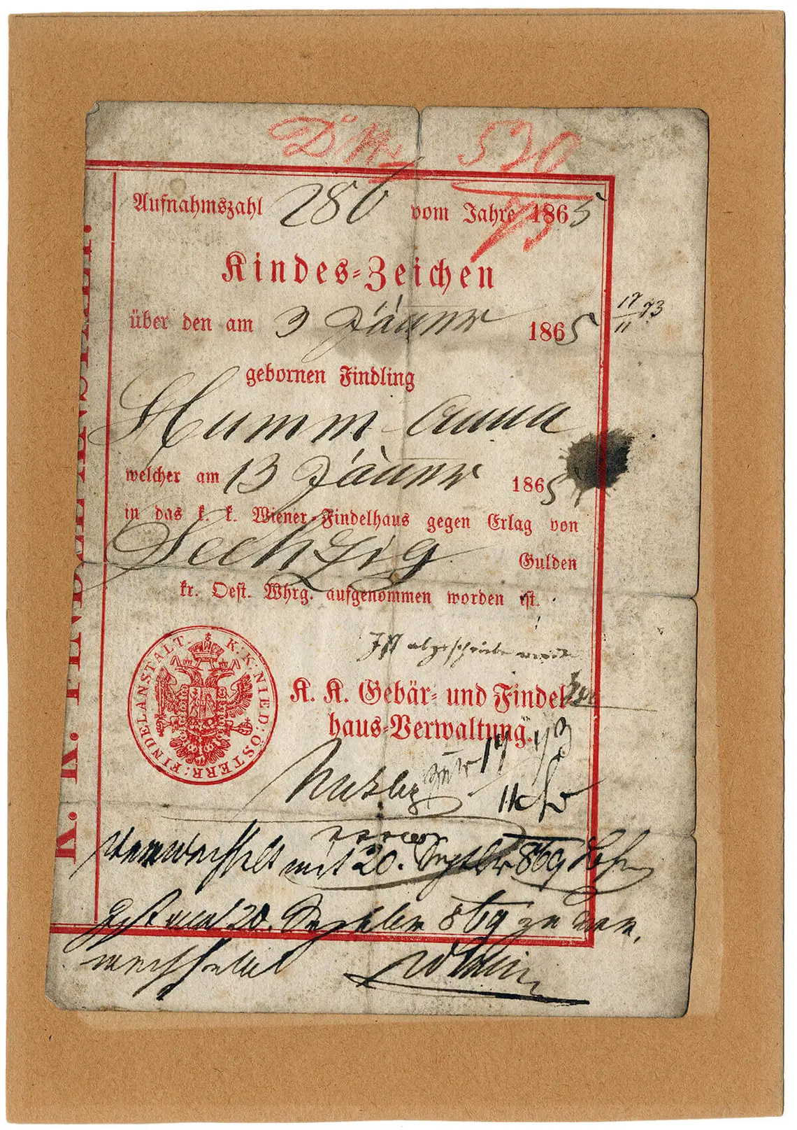 Im Findelhaus angekommen, wurden diverse biografische Angaben der Findelkinder sowie ihrer Mütter in Aufnahmebüchern (Findelhausprotokolle) vermerkt. Jedes Kind erhielt eine Laufnummer, um von nun an identifiziert werden zu können. Diese fand sich nicht nur auf dem Armband eines jeden Findelkinds wieder (Szene „Anlegung der Armbandnummer“), sondern auch auf ihren Ausweisen, den sogenannten „Kindes-Zeichen“. Ihre Mütter bekamen als Gegenstück den sogenannten „Empfangsschein“, mit dem sie zu ihrem Kind zugeordnet wurden, sollten sie es besuchen, oder zurückzunehmen wollen. Jüdischen Müttern blieb diese Möglichkeit aus antisemitischen Gründen allerdings verwehrt.