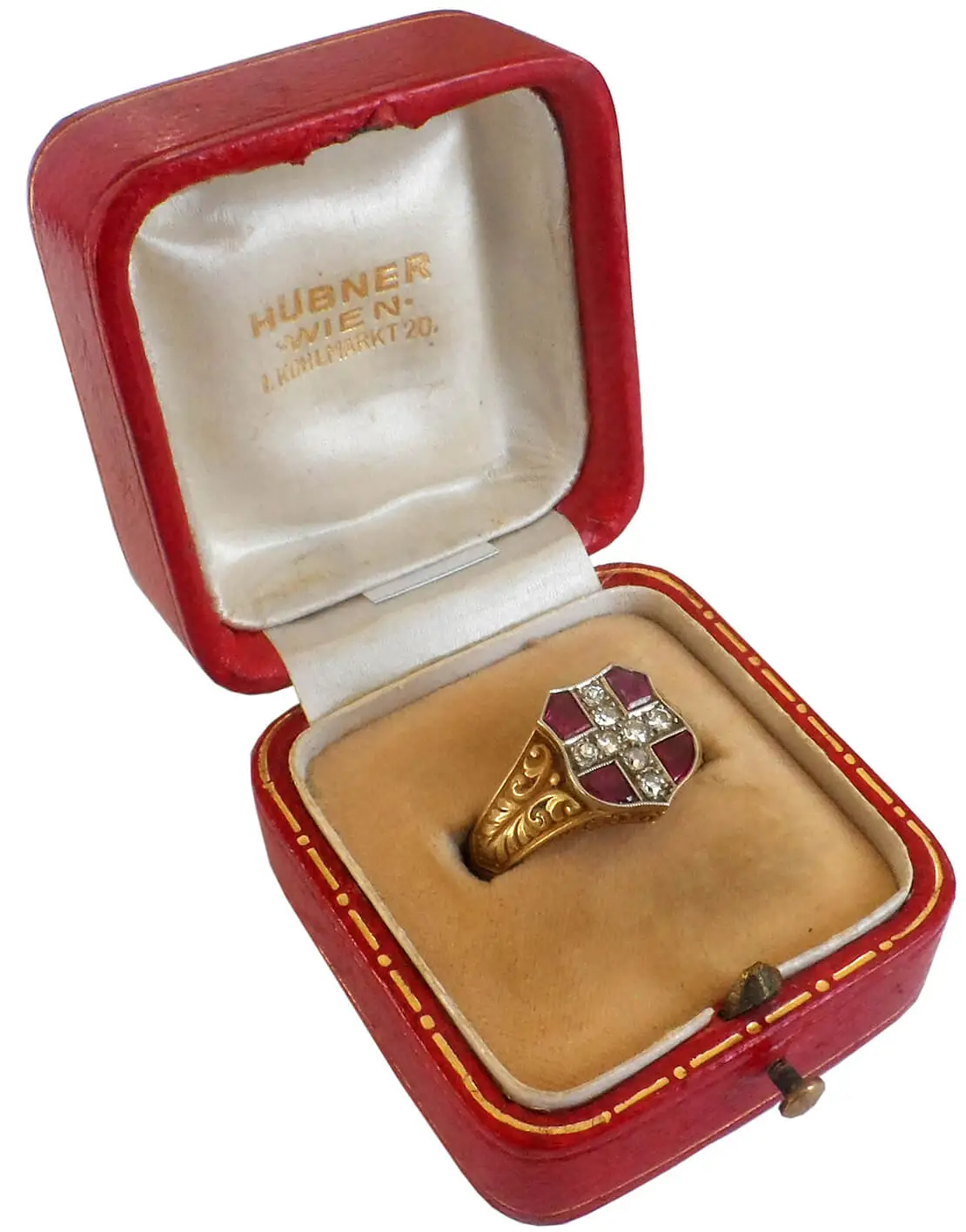 Mit dem Entwurf und der Herstellung wurde der Juwelier M. Hübner (Wien 1, Kohlmarkt 20) beauftragt. Der abgebildete Ring besteht aus 14 Karat Gold und trägt an der Innenseite neben der „585“-Feingehaltspunze die dazu korrespondierende Pferdekopfpunze „W“ (ab 1925) sowie die schlecht lesbare Herstellerpunze des Juweliers (Hübner?). An der Innenseite des Ringes befindet sich die handgeschnittene Gravur „Ehrengabe der Stadt Wien“ mit dem Zusatz des jeweiligen Jahres der Verleihung. Das aufgelegte Wiener Wappen besteht aus 8 Brillanten und 4 Rubinen. Der Ring wurde in einem roten Lederetui mit dem Innenaufdruck: „HÜBNER/·WIEN·/I, KOHLMARKT 20.“ verliehen.