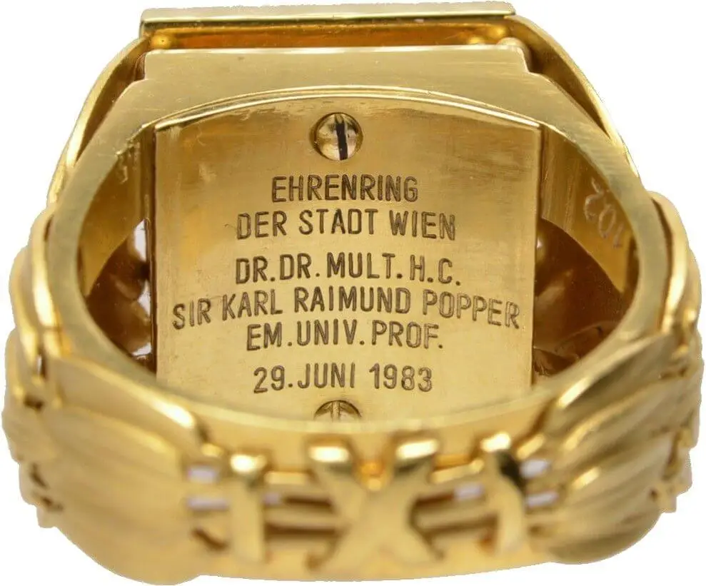 Ehrenring der Stadt Wien in der ab 1946 verliehenen Form; dieses Exemplar wurde 1983 an Karl Popper verliehen; Foto: Auktionshaus H.D. Rauch