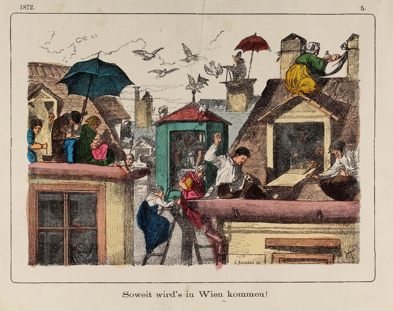 Was sich Anfang der 1870er-Jahre am Wiener Immobilienmarkt abspielte, zeigt ein Blick auf die folgenden Zahlen: In nur vier Jahren, von 1870 bis 1873, wechselten über 5.000 Hauser bzw. Hausanteile und knapp 1.900 Baustellen und Parzellen den:die Eigentümer:in. Durchschnittlich alle 22 Jahre gelangten Wiener Hauser in neuen Besitz. Die Bodenpreise schossen in die Hohe, Grundstücke und Häuser wurden zur begehrten Ware, Mieten stiegen explosionsartig an. Menschen, die sich das Leben innerhalb des Linienwalls nicht mehr leisten konnten, zogen in die Vororte. Insbesondere am Mittel-und Kleinwohnungsmarkt kam es zu einer nie dagewesenen Verknappung und Verteuerung. Der Bauboom jener Jahre konnte die Wohnungsnot nicht annähernd mildern. Und die Wiener Bevölkerung war diesbezüglich leidgeprüft. Mit dem rasanten Bevölkerungswachstum der Stadt seit Beginn des 19. Jahrhunderts waren Teile der Wiener Bevölkerung von einer chronischen Wohnungsnot geplagt. „Die Wohnungsnoth ist in Wien zu einer bleibenden Calamität geworden“, erklärte der Nationalökonom Emil Sax 1869. Während die vor allem aus Böhmen, Mähren und Norditalien zugewanderten Arbeiter:innen und Tagelöhner an Wiens Prachtbauten arbeiteten, fanden sie für sich selbst kaum eine Unterkunft. Der Wohnungsbedarf war Anfang der 1870er-Jahre dermaßen groß, dass alle möglichen Gebäude und Räume, Glashäuser, Schuppen, Ställe, Lagerräume, sogar Kohlenmagazine zur „Wohnung“ für die zugewanderten Arbeiter:innen umfunktioniert wurden.