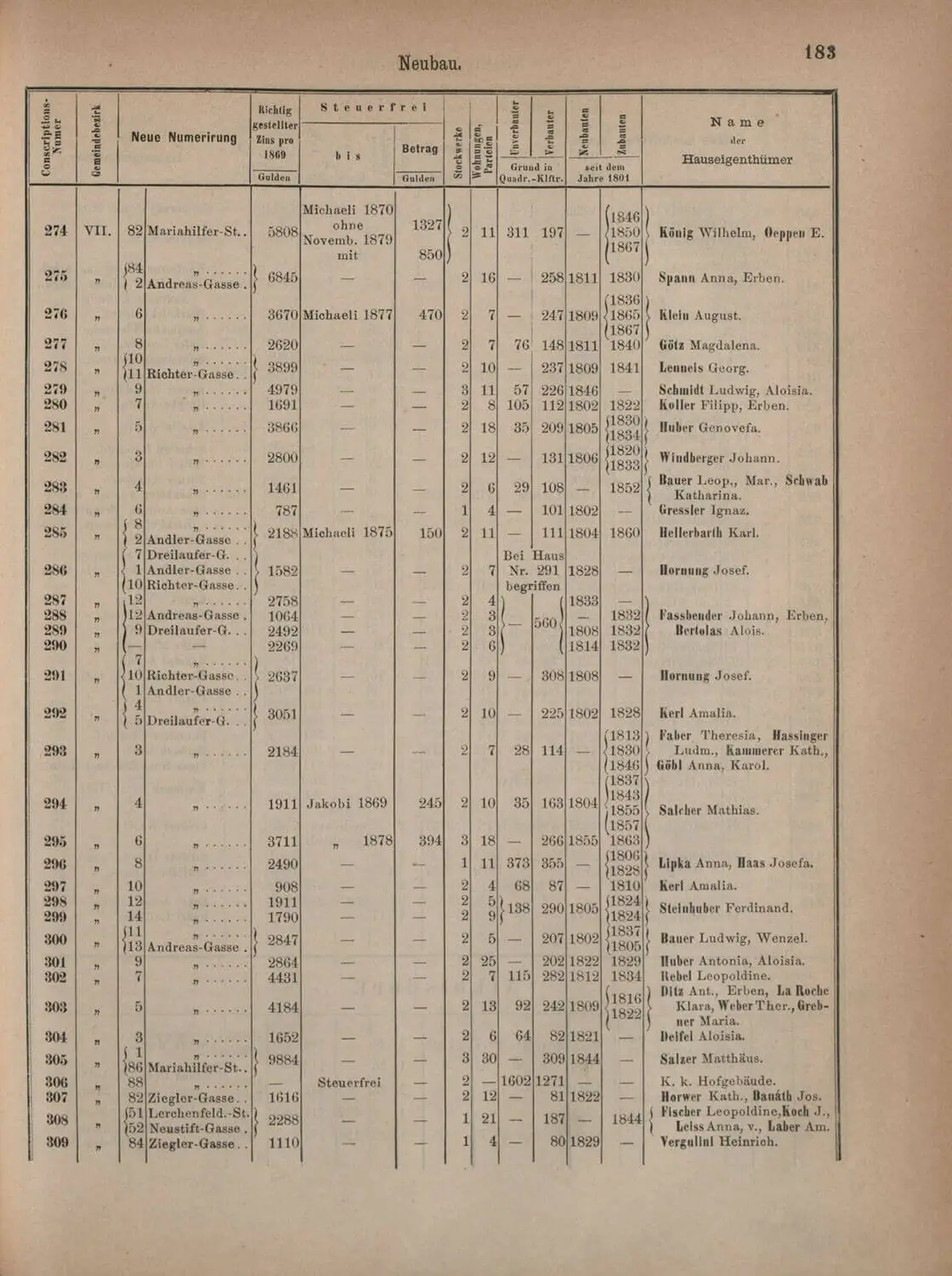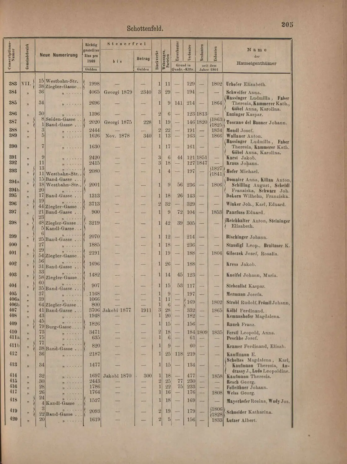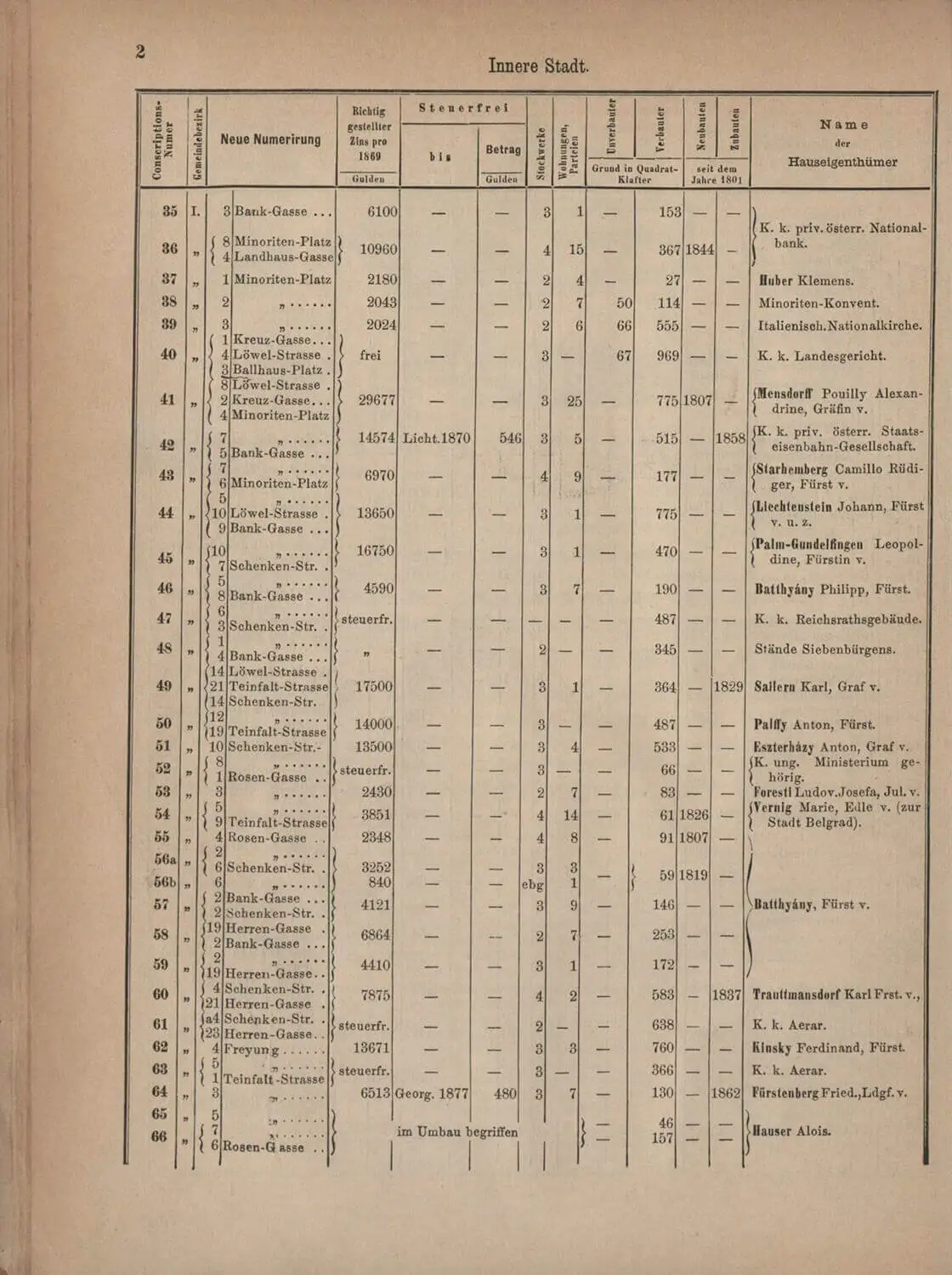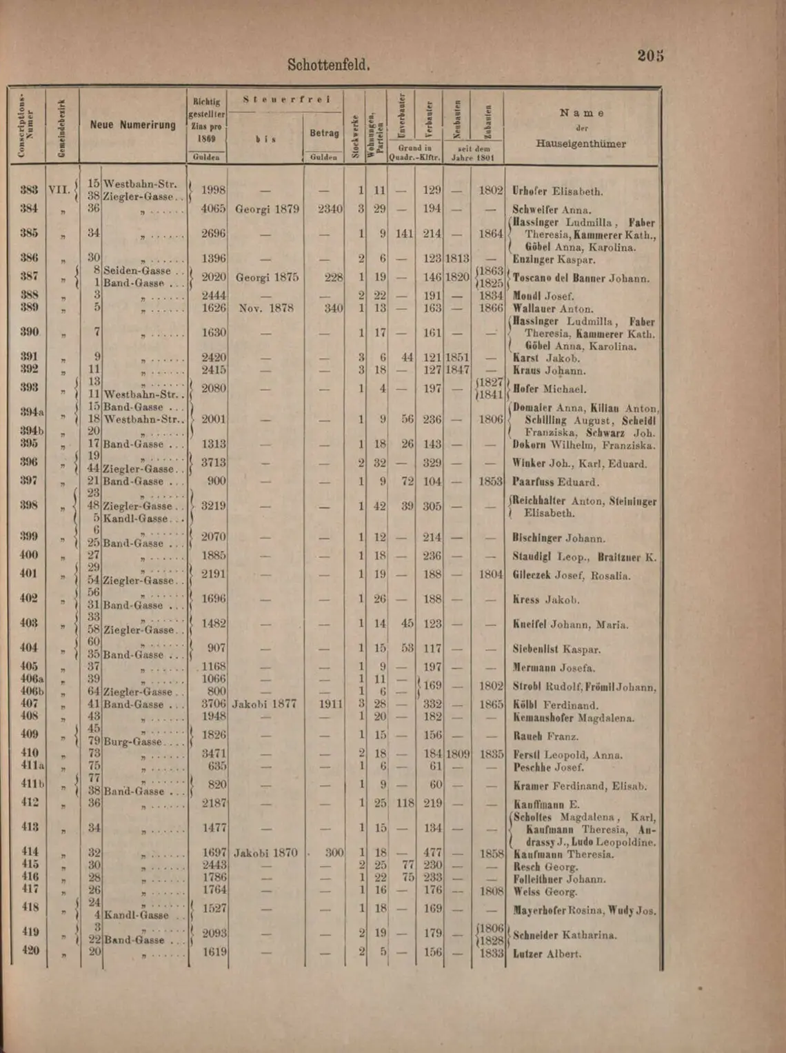Wiens Häuser wurden fortan zum beliebten Investment. Das zeigt sich nicht zuletzt daran, dass man 1869 beschlossen hatte, im Häuserkataster der Stadt erstmals ausführliche Daten zu den Wohnbauten zu veröffentlichen. Es gab nun Angaben über das Baualter des Hauses, über eventuell durchgeführte Zubauten, über die Größe der bebauten und nicht bebauten Grundflache, über die Zahl der Stockwerke und die Anzahl der Wohnungen, über den jährlichen Zinsertrag, die Anzahl an Steuerfreijahren sowie Angaben zum Steuerfreibetrag (die genannten Daten sind bis zum Kataster des Jahres 1905 aber nur für die Bezirke 1 bis 9, 20 und ab 1874 für Favoriten vorhanden. In allen anderen Bezirken wird bis 1905 nur der:die Hausbesitzer:in genannt.). Im Häuserbuch der Stadt ist zu diesem Novum zu lesen: „Die Zusammenstellung dieser Daten erschien um so wünschenswerther, als Manche derselben, wie z. B. der Umfang der Area, die Jahreszahlen der Bauführung von einem Privaten oft nur mit Mühe und vielem Zeitaufwande erhoben werden können.“ Anhand der öffentlich zuganglichen Daten konnte nun von jedermann die Rentabilität eines Hauses geschätzt werden.