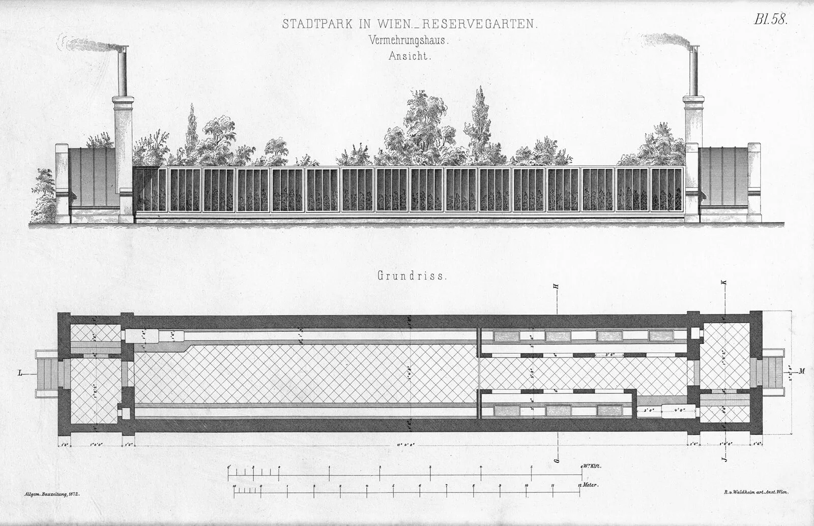 Aufgrund mehrfacher Verzögerung konnte Stadtgärtner Siebeck erst im März 1867 einen Plan für den städtischen Reservegarten längs des Wienflusses zwischen der Schwarzenberg- und der Johannesbrücke (später Tegetthoff-Brücke) vorlegen. Spätestens im Juli 1867 wurde mit den Bauarbeiten begonnen. Am 1. Oktober 1868 war es aber soweit: Auf einer Fläche von rund 17.000 m² konnte der Reservegarten mitsamt der für den Betrieb notwendigen Gebäuden seiner Bestimmung übergeben werden. Am auffälligsten war das Wohn- und Kanzleihaus des Stadtgärtners. Von der Lastenstraße aus gesehen schloss sich links das Kalthaus und eine ebenso lange Treibkiste an, rechts hingegen das Warmhaus und eine Gruppe von Treibkisten. Außerdem gab es noch ein Vermehrungshaus, einen Schupfen sowie Ställe.
