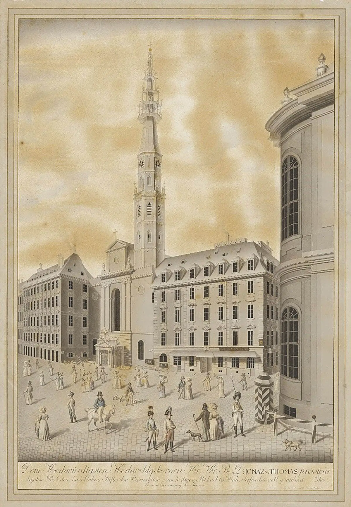 Karl Preschnopfsky: Dem Hochwürdigsten Hochwohlgebornen Hr: Hr: R: D: Jgnaz v: Thomas , preiswürdigsten Probsten des löblichen Stiftes der Barnabiten zum heiligen Michael in Wien, ehrfurchstvoll gewidmet. Ihm Jahre 1825 bey reparirung des Thurmes, aquarellierte Tuschzeichnung, Wien Museum, Inv.-Nr. 250080 bzw. 250081