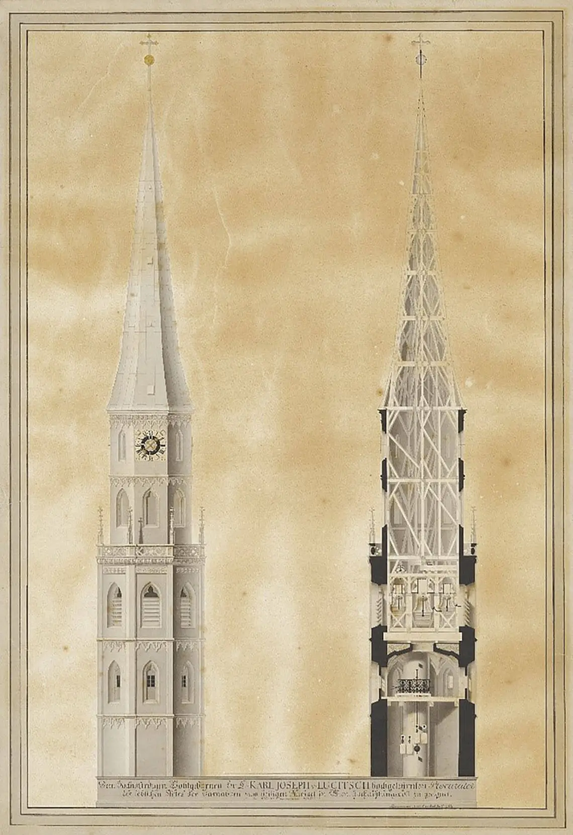 Die Generalsanierung des Turmdachwerks, bei der vor allem der untere Teil der Konstruktion von 1594-1597 ausgewechselt werden musste, und die Neueindeckung wurden von dem Zimmermann Alois Bader geleitet. In der topographischen Sammlung des Wien Museums haben sich dazu zwei bemerkenswerte aquarellierte Tuschzeichnungen erhalten, die Karl Preschnopfsky 1825 angefertigt hat [Abb. 5, 7]. Die Ansichten zeigen die Renovierungsarbeiten mit einem Außengerüst in schwindelerregender Höhe und eine Ansicht sowie einen Schnitt, der die Holzkonstruktion detailliert als Meisterwerk der Zimmermannskunst darstellt. Entsprechende Konstruktionszeichnungen sind selten und daher eine beeindruckende Neuentdeckung.