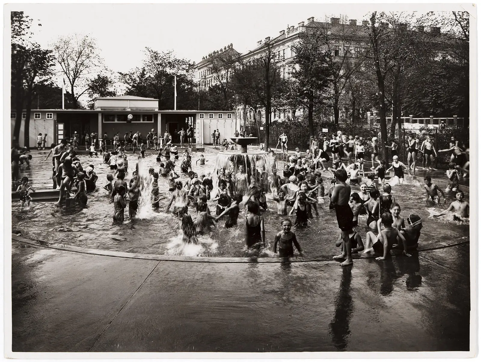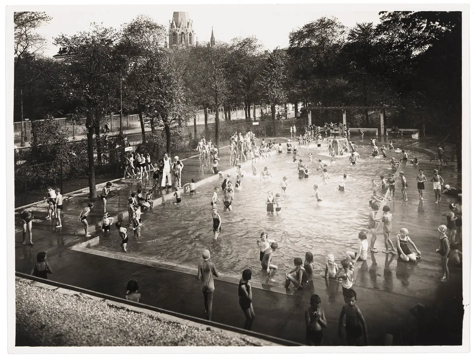 Ein weiterer Blick in die Geschichte zeigt noch eine andere, langjährige Nutzung dieses vielseitigen Ortes. So wurde just am Areal des heutigen Sophienparks, seinerzeit ein von Bäumen umsäumter, parkähnlich gestalteter Grünraum, im Jahr 1930 ein Kinderfreibad der Gemeinde Wien errichtet. Wie auf den beiden historischen Fotografien Fritz Sauers zu erkennen, sind im Hintergrund die Lazaristenkirche beziehungsweise die Mauer zum Sophienspital zu sehen, wodurch sich die Lage des Bades exakt verorten lässt. Dem Ruf nach Licht, Luft und Sonne – eine der wesentlichsten Forderungen der 1920er-Jahre – folgend, hatte die Stadt zahlreiche solcher Bäder geschaffen. Ziel war es, mit diesem Bädertyp schulpflichtigen Kindern zwischen sechs und vierzehn Jahren unentgeltlich das sichere Spielen, Baden und Planschen in ihrer unmittelbaren Umgebung zu ermöglichen. Sie sollten durch Bewegung an der frischen Luft und in der Sonne gesundheitlich gestärkt werden.