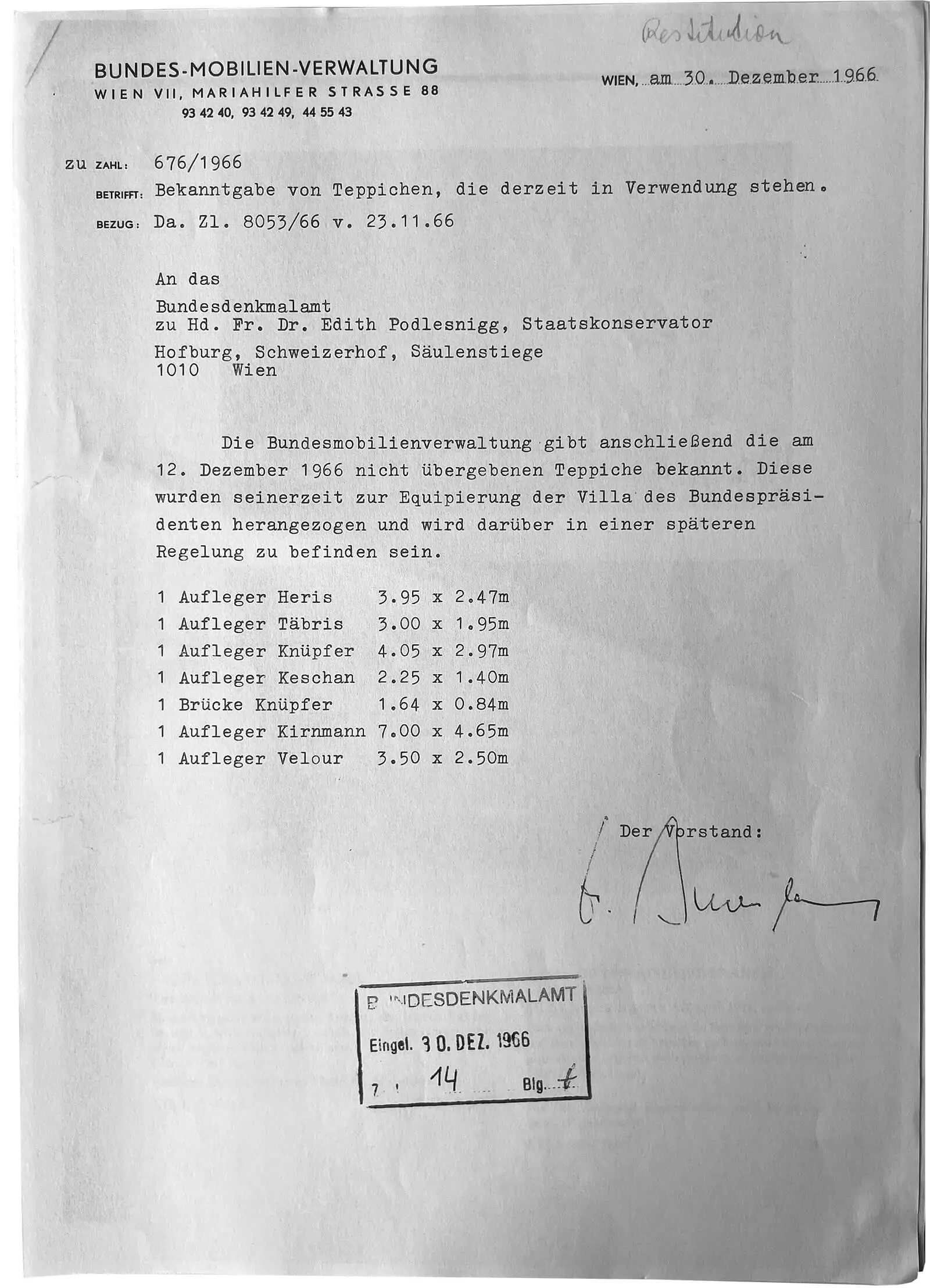 Verblüffend ist ein dünner Akt, der in einem der schweren grauen Kartons mit Restitutionsmaterialien des BDA ganz unten liegt. Darin meldet die Bundes-Mobilien-Verwaltung im Jahr 1966, dass sieben wertvolle Teppiche aus NS-Raubgut „seinerzeit zur Equipierung der Villa des Bundespräsidenten“ verwendet wurden – und immer noch werden. Hintergrund: Die Präsidentenvilla war unter den Nazis „arisiert“, 1950 schwer beschädigt an die Besitzer rückerstattet, von ihnen zu einem Billigpreis veräußert und vom Käufer renoviert teuer an die Republik verkauft worden.