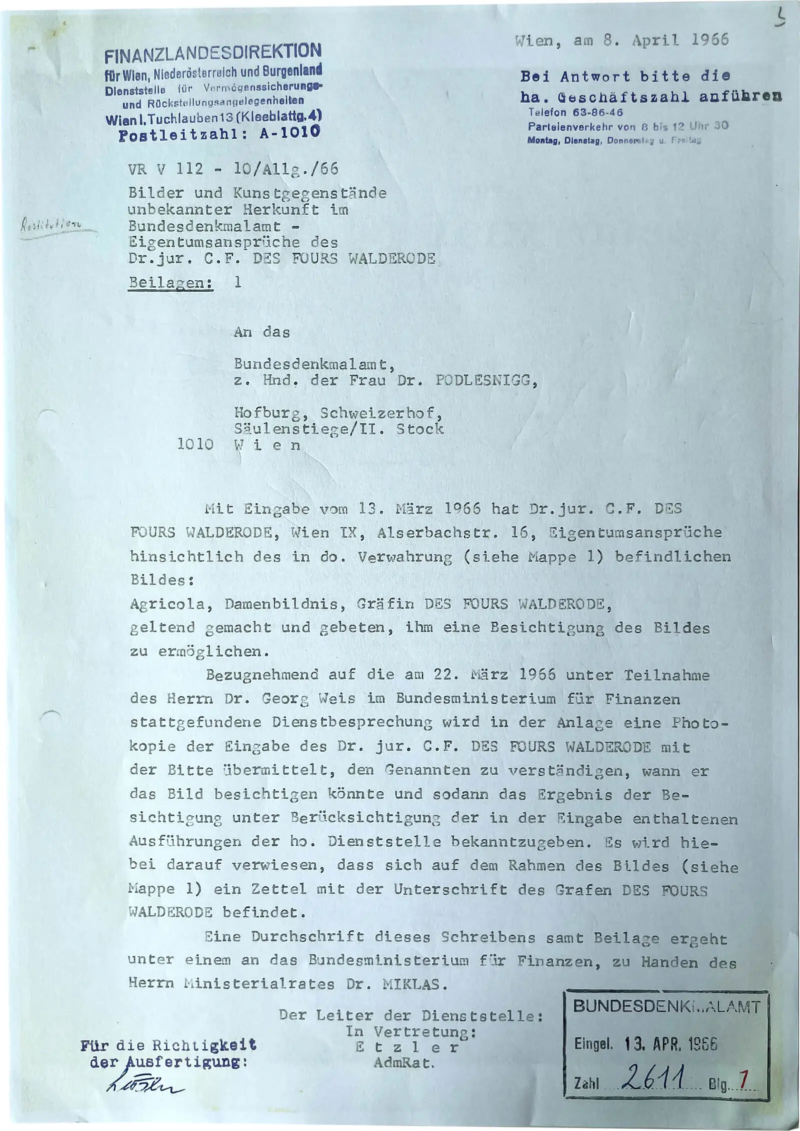 Der Skandal: Den Behörden waren die Namen vieler einstiger Eigentümer:innen immer bekannt – wider besseres Wissen versicherten sie jedoch, die Objekte seien „herrenlos“. Dass man jedoch nicht mit allen Beraubten gleich verfuhr, zeigen Akte über Antragsteller:innen, die nicht jüdisch waren. Denn während die Shoah-Überlebende Madelaine Duke ihre Adresse und Ansprüche dem Bundesdenkmalamt übermittelt hatte und nie kontaktiert, wurde, finden sich etwa zum böhmischen Adelsgeschlecht Des Fours Walderode Unterlagen, das Denkmalamt solle den Antragsteller verständigen, „wann er das Bild besichtigen könne“, denn die „Unterschrift des Grafen“ befinde sich auf dem Bilderrahmen.