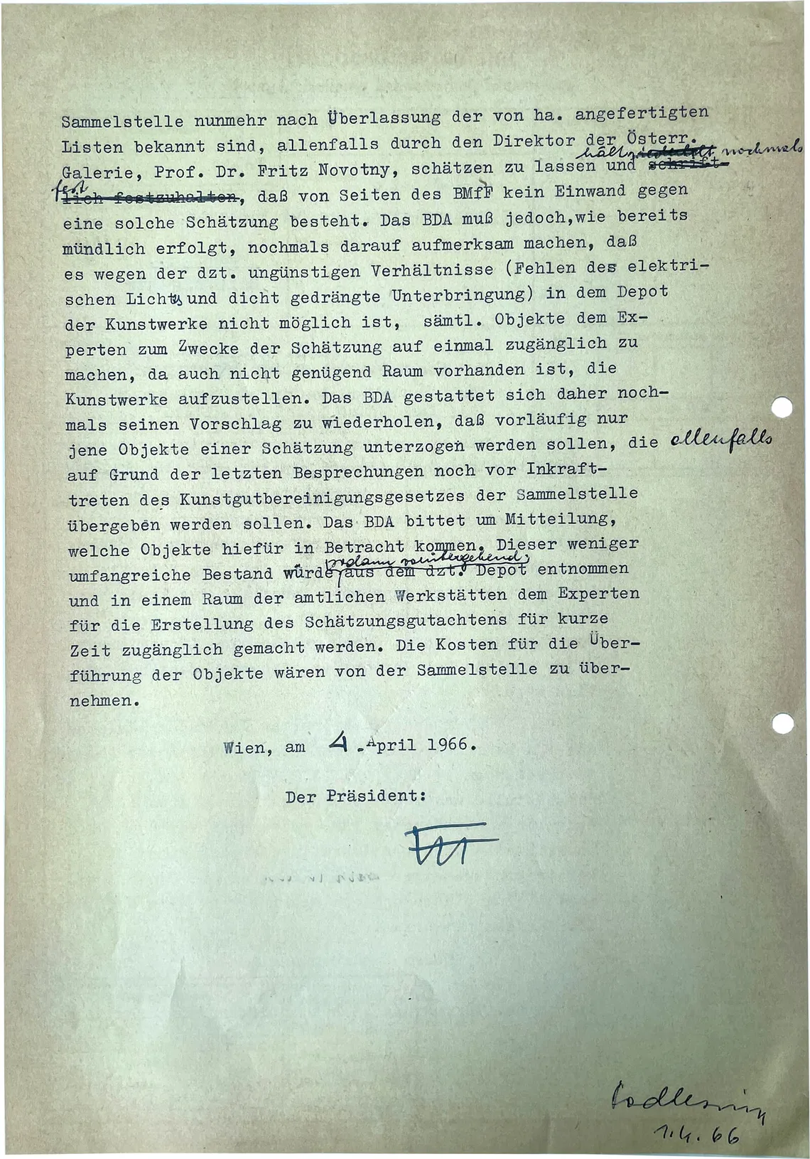 Bevor wir in die Wien-Erkundung der Journalisten von ARTnews eintauchen, noch zu kleinen, doch vielsagenden Entdeckungen in den BDA-Mauerbach-Akten während der Recherche zu diesem Beitrag. Da findet sich etwa ein Brief von Lenz Moser, Besitzer des bekannten gleichnamigen Weinguts, in dem er Edith Podlesnigg im Frühjahr 1968 an seine Anfrage erinnert „ob die 4 Statuen von Prof. Ambrosi verkauft werden“. Die Beamtin, schreibt er, habe ja eine Entscheidung für den Winter angekündigt. Die Frage, ob mit NS-Raubgut auch Handel geplant war, bleibt offen.