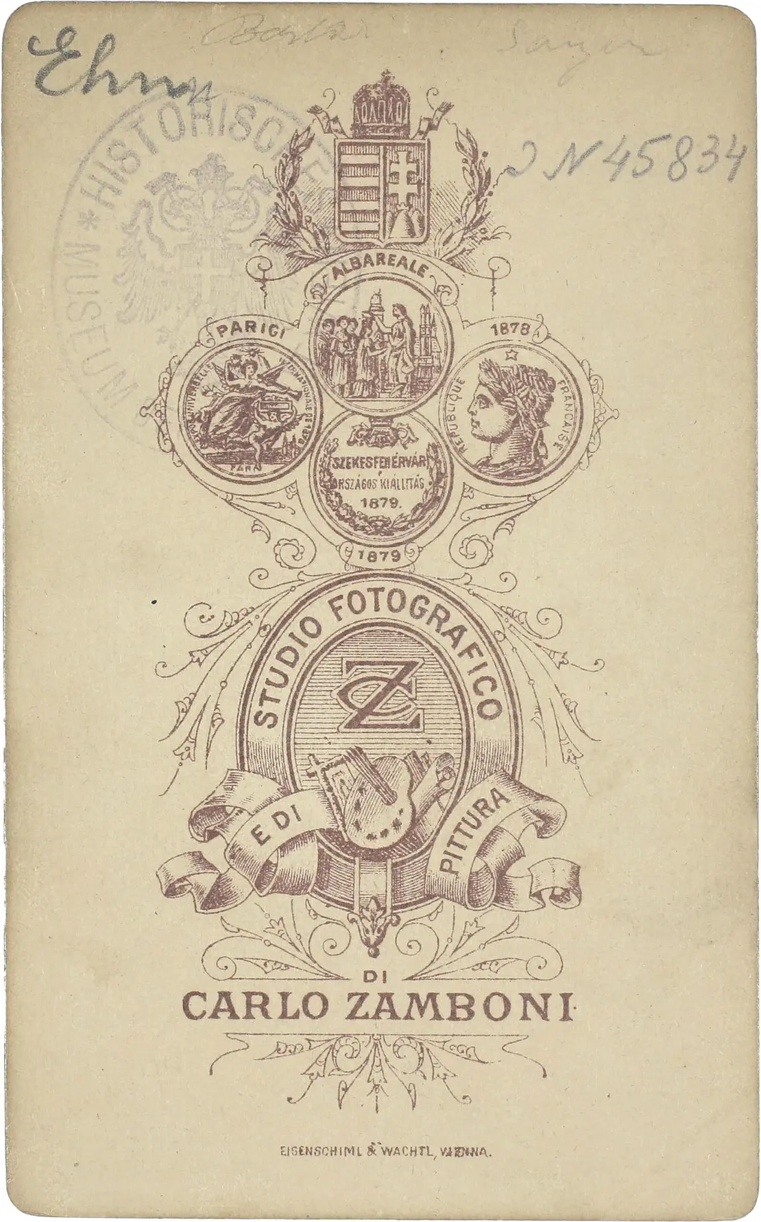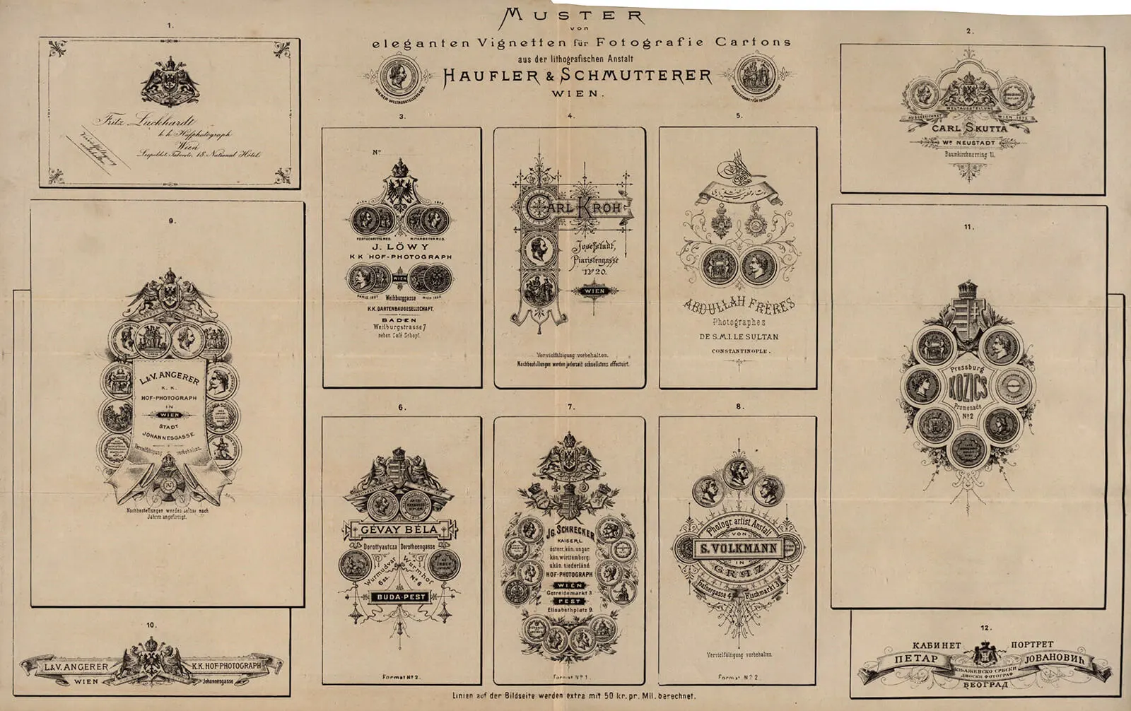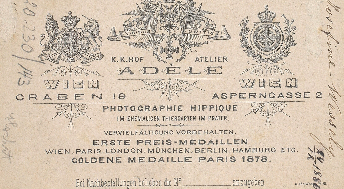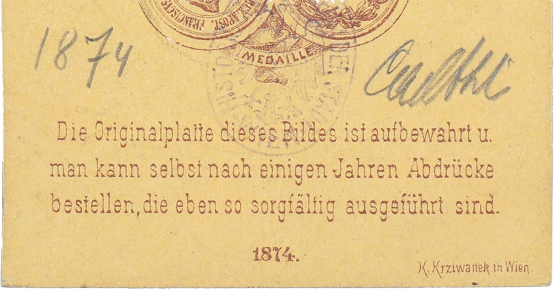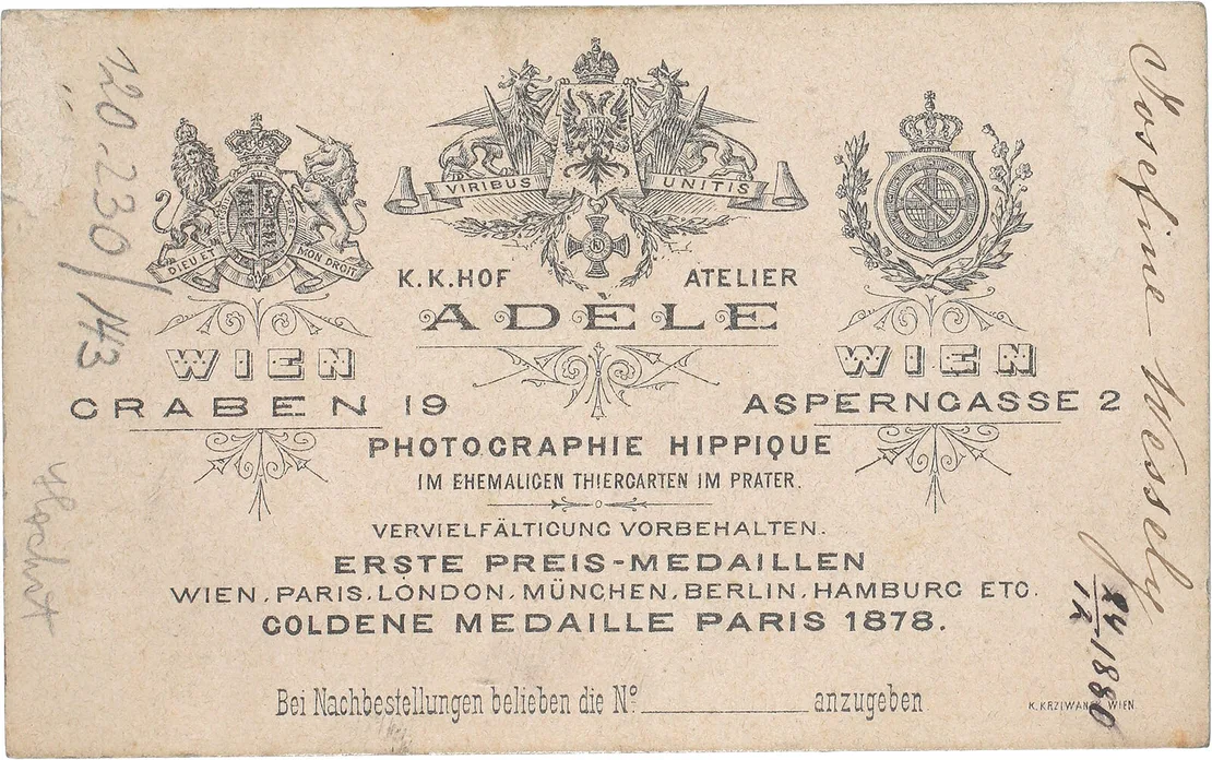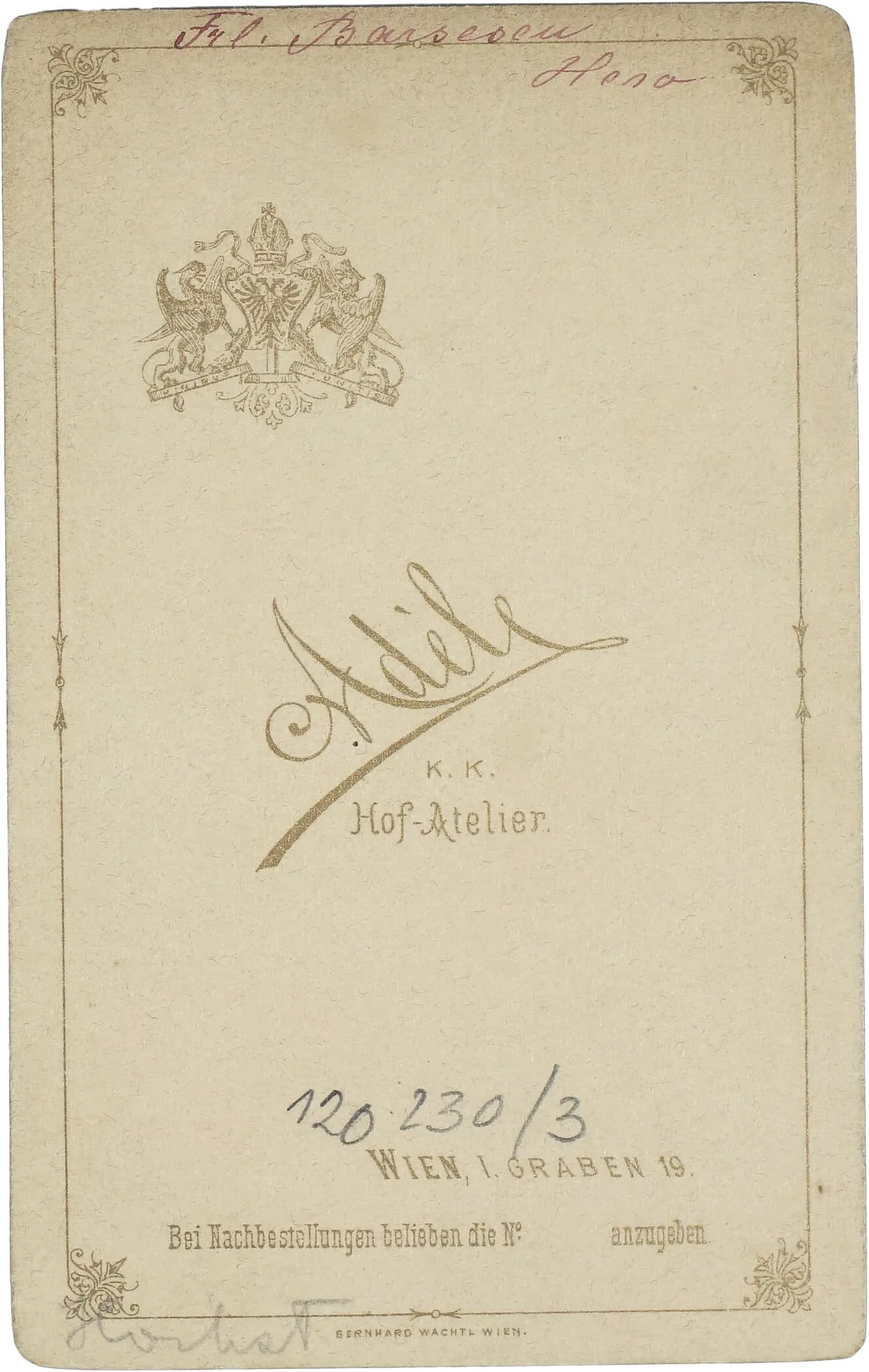 Die Rückseiten des Untersatzkartons wurden mit dem Namen der Fotograf:innen bzw. des Ateliers sowie der Anschrift bedruckt. Zur besseren Selbstvermarktung kamen zusätzlich Informationen hinzu, die über die Auszeichnungen des Atelierinhabers bzw. der Atelierinhaberin Auskunft gaben: Preismedaillen, deren Vorder- und Rückseite abgebildet waren, oder der Titel k.k. Hoffotograf oder Hoffotografin sowie die damit einhergehende Darstellung des Wappens des Kaiserhauses. Dementsprechend war es wichtig, die Rückseite up-to-date zu halten. Etwaige Adressänderungen mussten aktualisiert werden, beispielsweise aufgrund eines Umzugs oder im Falle einer neu eröffneten Zweigstelle des Ateliers. Sollte eine neue Medaille gewonnen oder ein Titel bzw. ein Orden verliehen worden sein, musste sich dies auf der Rückseite wiederfinden.