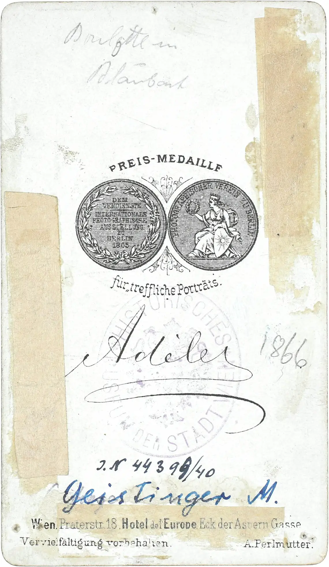 Als Beispiel für eine derartige „Untersatzkarton-Chronologie“ sind hier die Cartes de visite der Fotografin Adele Perlmutter (1845-1941) zusammengestellt. Das Atelier wurde 1862 vom Vater Samuel eingerichtet und bestand bis 1938, als es aufgrund der Verfolgung durch die Nationalsozialisten aufgegeben werden musste. Adele Perlmutter (verh. Heilpern) selbst war wohl bis in die (erste Hälfte der) 1880er Jahre als Fotografin aktiv, um das Geschäft schließlich an ihre Brüder abzugeben. Bis 1878 ist allein sie in „Lehmann's Allgemeiner Wohnungs-Anzeiger von Wien“ unter „Geschäfts- und Gewerbetreibenden“ in der Rubrik „Photographen“ verzeichnet. Ihre Brüder Wilhelm (k.k. Hoffotograf ab 1880) und Max werden bei Lehmann 1876 unter „Nachweis der Einwohner von Wien“ (und nicht unter den Geschäfts- und Gewerbetreibenden) erstmals beide als Fotografen genannt und Wilhelm zudem als „Chef d. Hof-Fotogr. Ateliers „Adele“, Graben 19“.