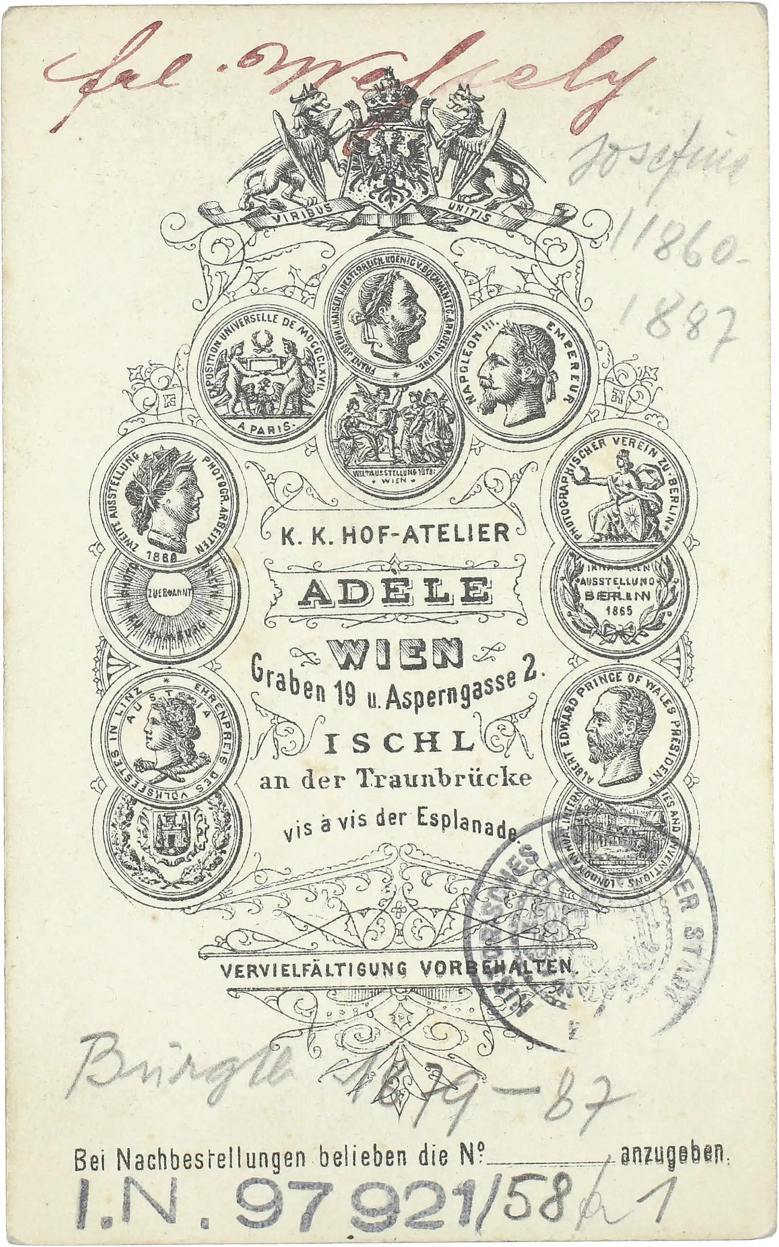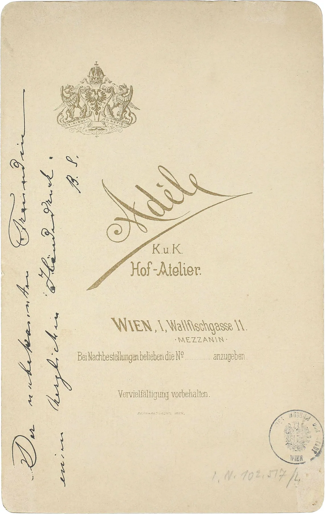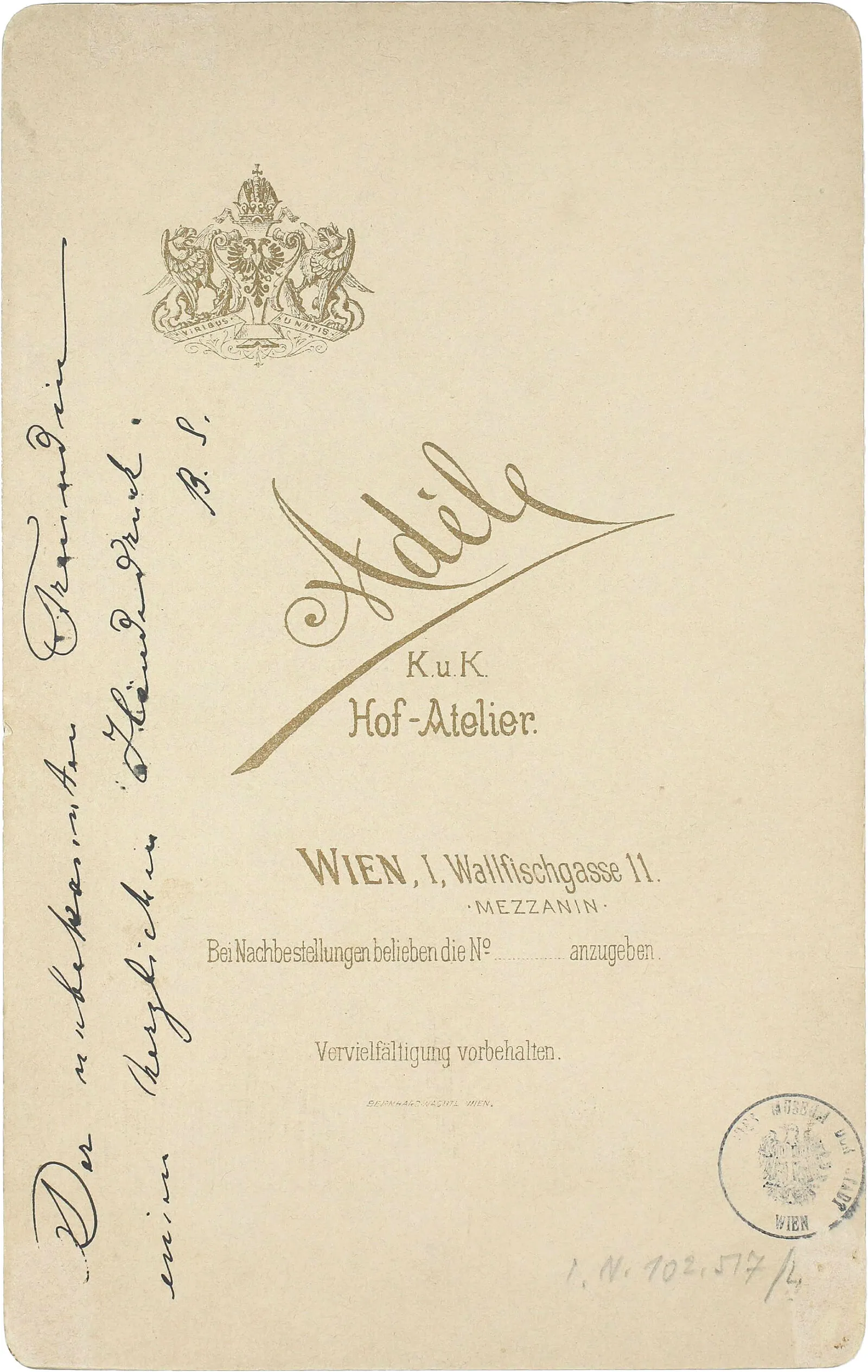 Unklar ist, ob diese Kartongestaltung eine Zeit lang parallel mit der eben vorgestellten Rückseite verwendet oder von dieser abgelöst wurde. Definitiv stellt die Rückseite einen Wendepunkt dar: Bis Anfang/Mitte der 70er Jahre wird Adele auf der Rückseite explizit als k.k. Hof-Fotografin bezeichnet, was nunmehr durch k.k. Hof-Atelier ersetzt wird. Sukzessive verschwindet Adele Perlmutter und ihre fotografische Tätigkeit – zuerst von den Rückseiten und dann wohl auch aus den Ateliers.