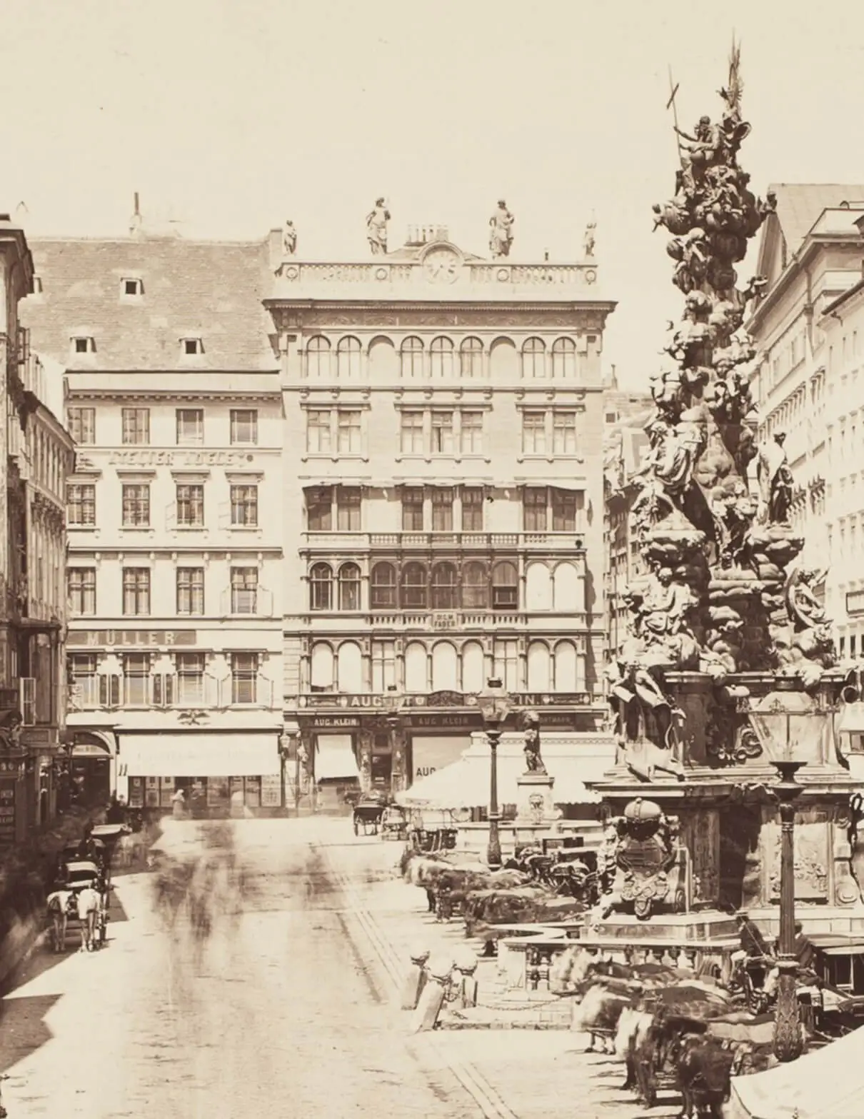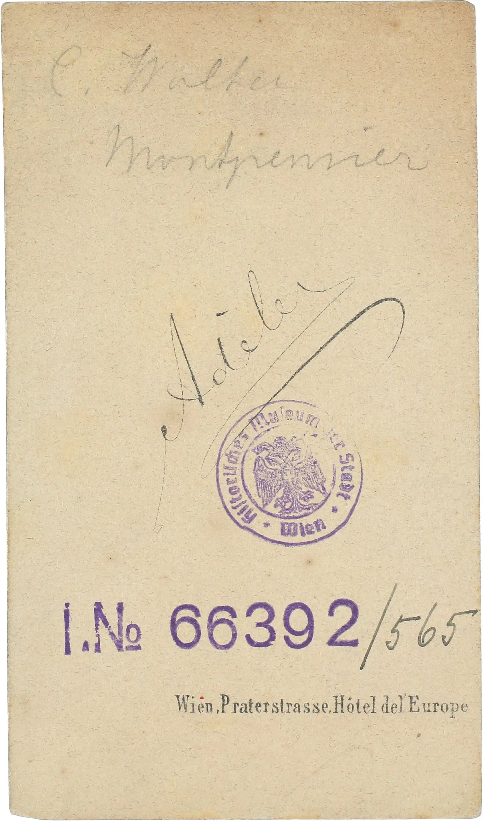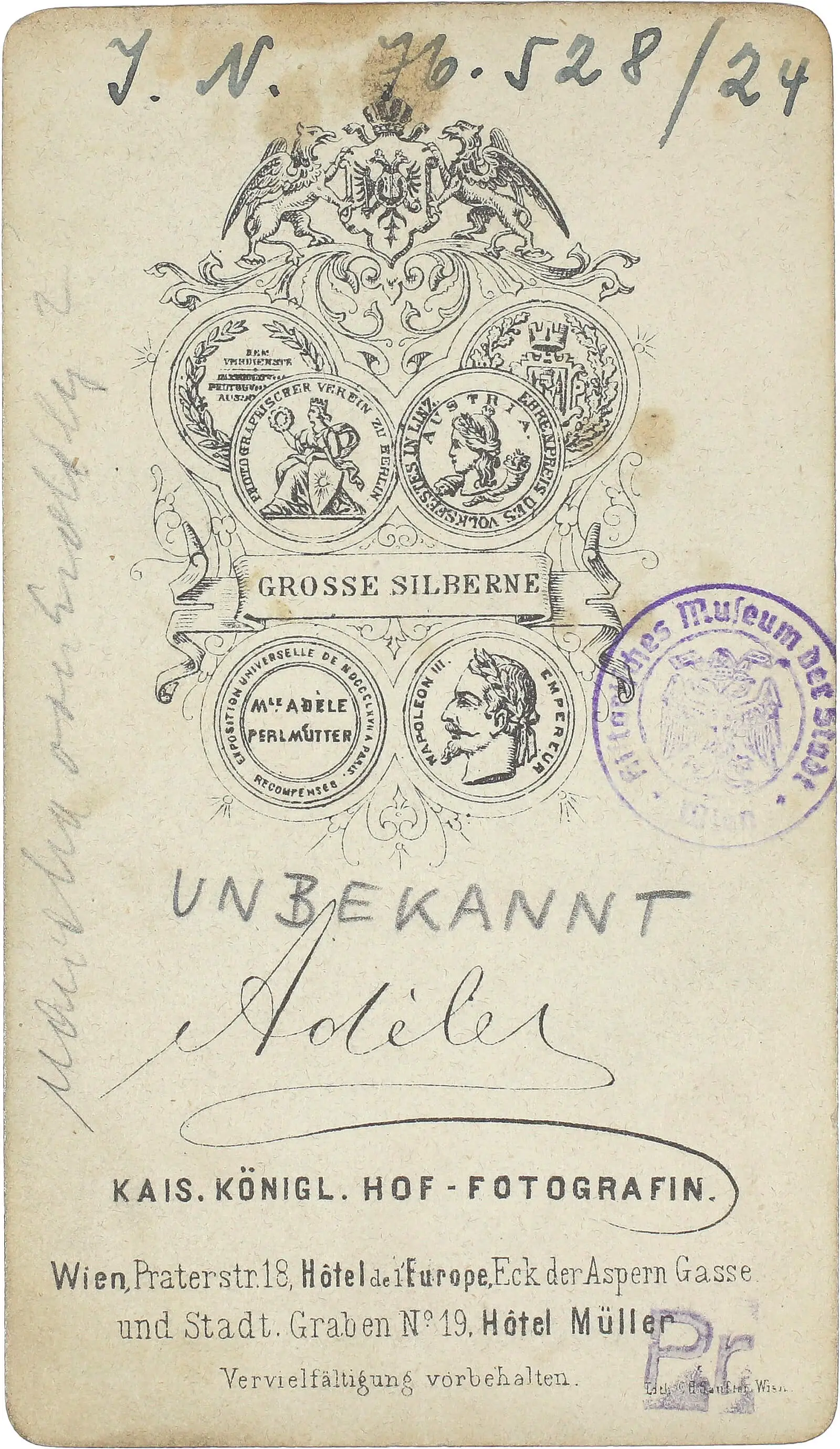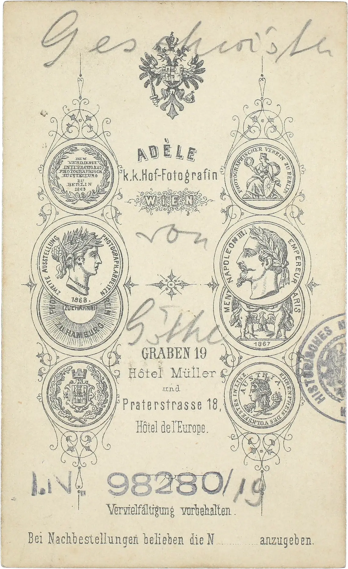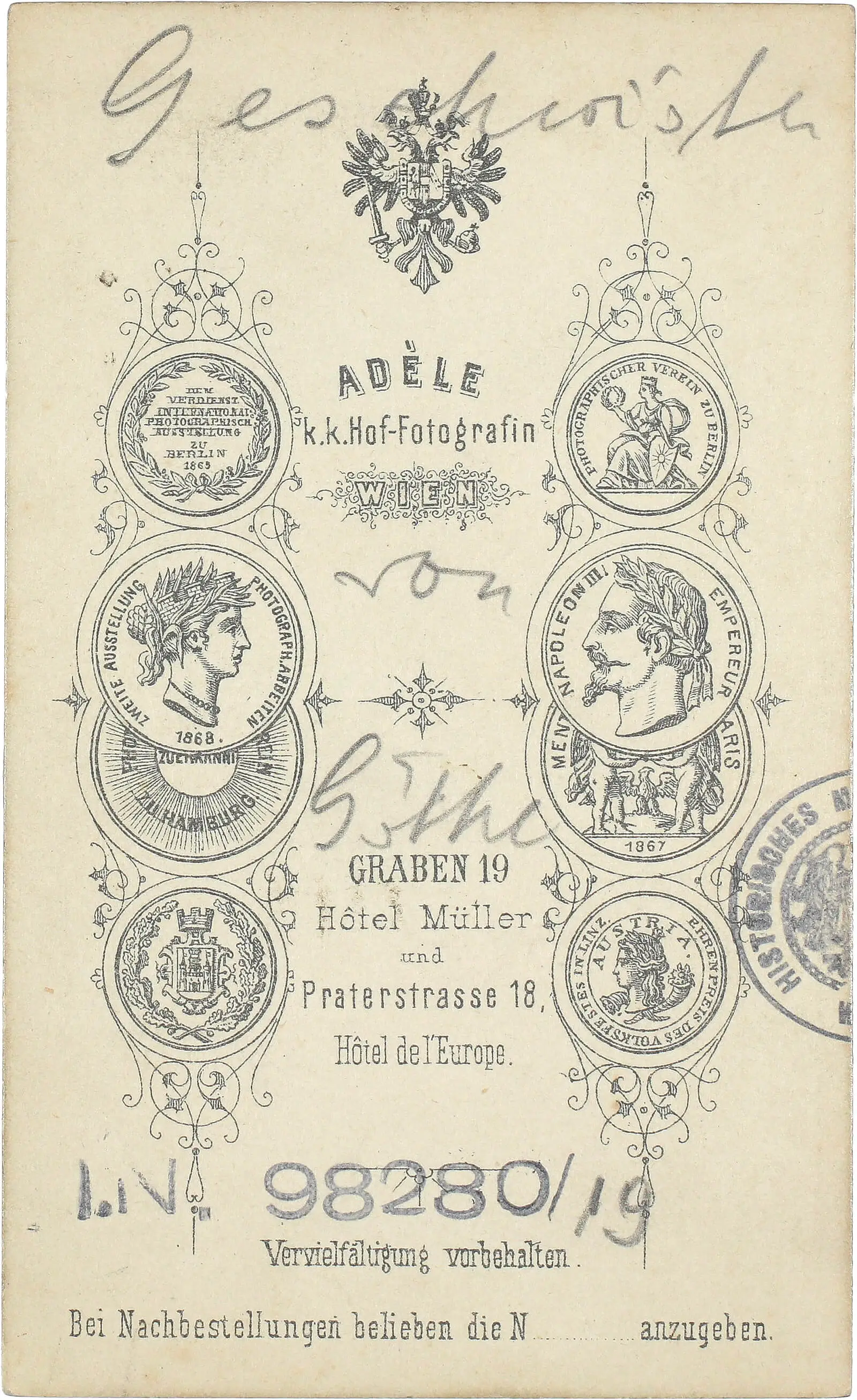 Die zweite wichtige Filiale mit der Adresse „Graben 19“ wird bei Lehmann erst 1874 erwähnt, die untersuchten Rückseiten zeichnen ein anderes Bild: So gibt es Fotografien, die auf der Vorderseite mit der Jahreszahl 1868 versehen sind, und auf der Rückseite neben dem in diesem Jahr verliehenen Titel k.k. Hoffotografin und der Abbildung des kaiserlichen Wappens bereits die Adresse „Stadt, Graben № 19, Hôtel Müller“ (nächstes Bild, links) aufweisen.