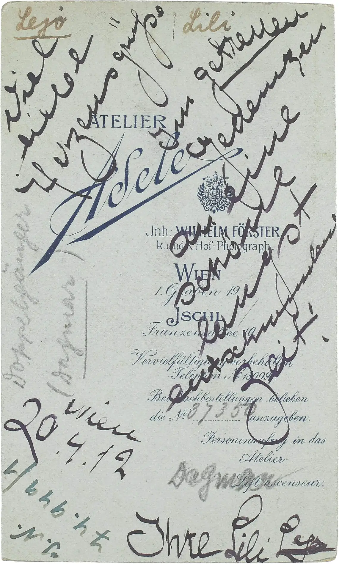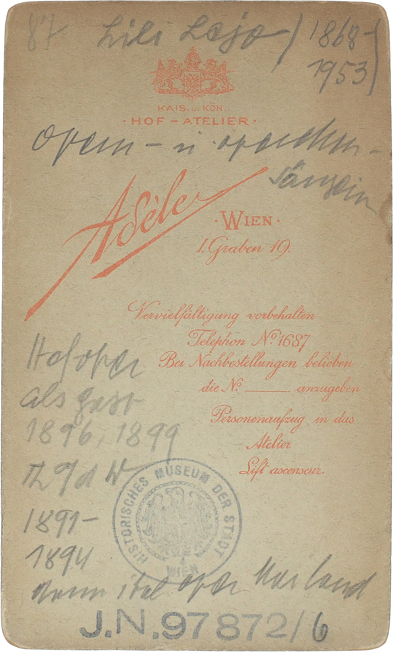 Insgesamt scheint die Information auf dem Revers ab den 1880er Jahren stark reduziert worden zu sein, da außer dem Namen des Ateliers nur die Adresse abgedruckt ist. Ab etwa 1890 kam vermutlich die Telefonnummer auf der Rückseite hinzu (Lehmann 1890: erstmals bei der Filiale am Graben ein T[elephon] vermerkt) .