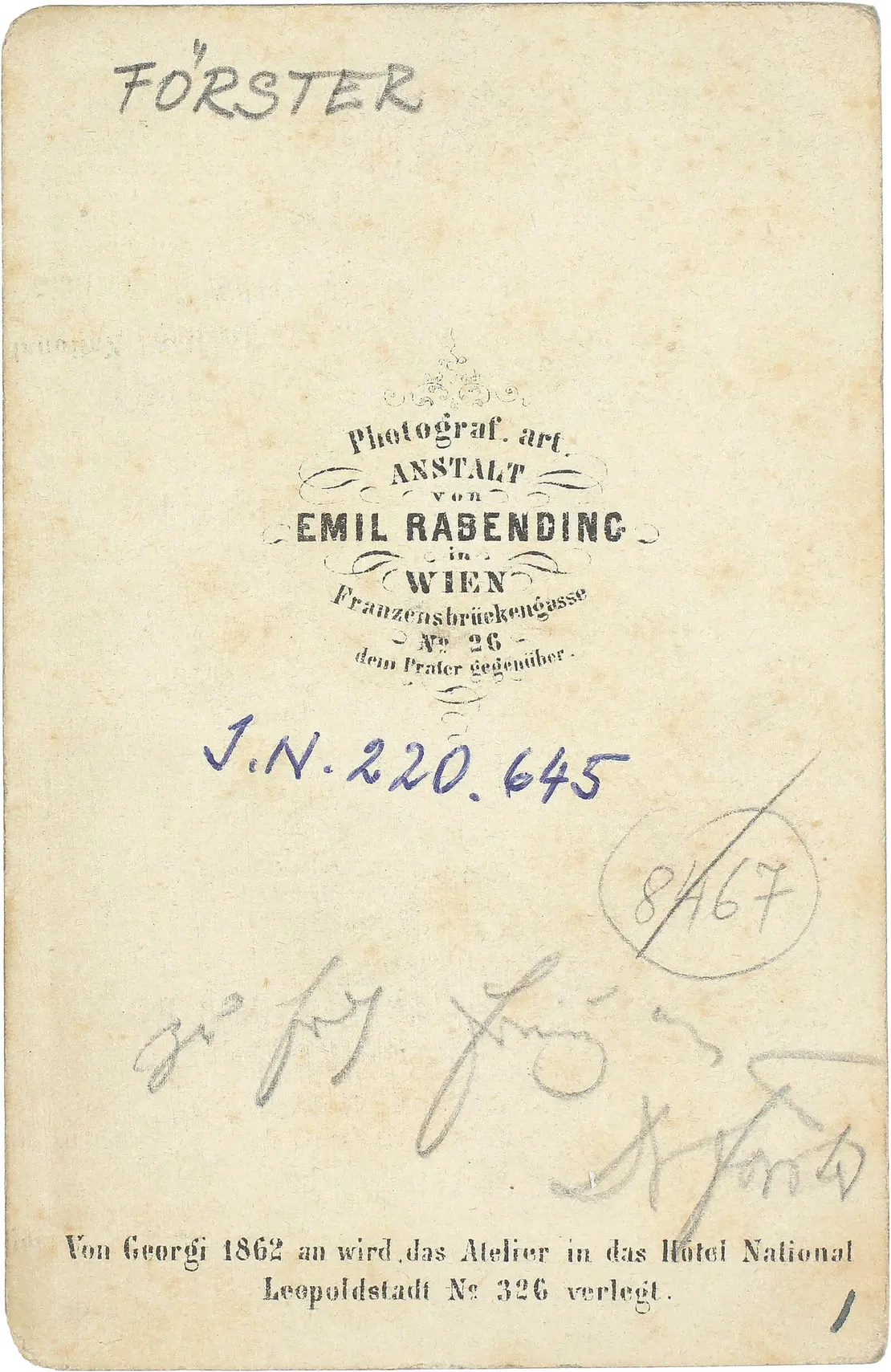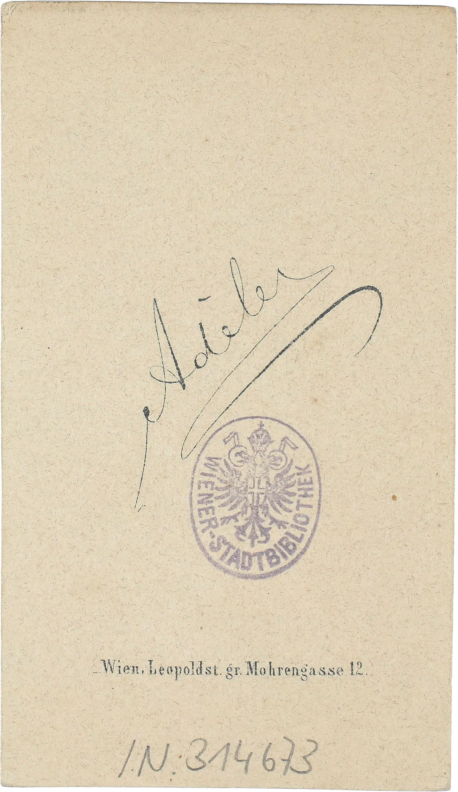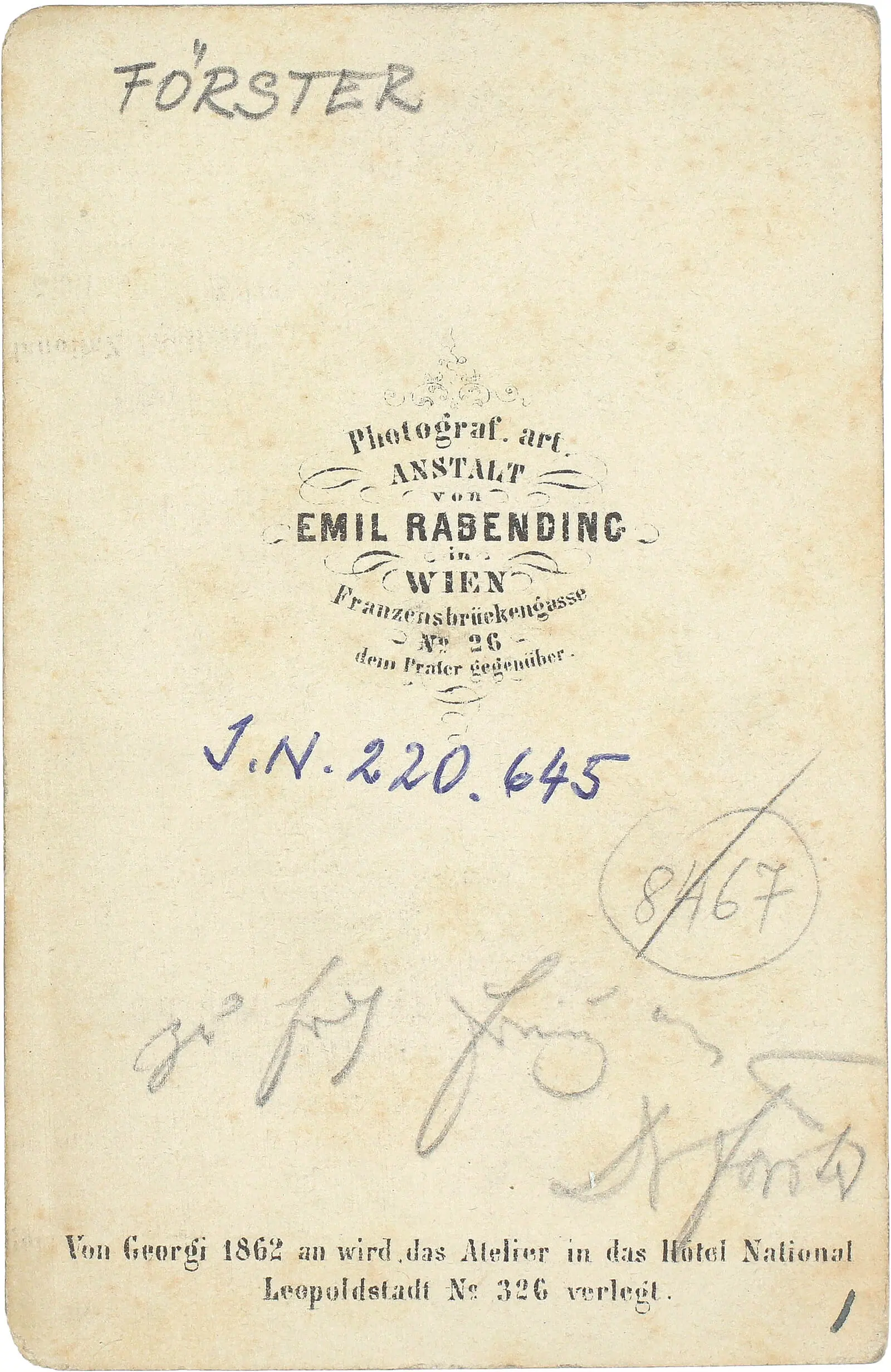 Wilhelm und Max scheinen ab dem Ende der 1870er Jahre eine immer wichtigere Rolle in den Ateliers zu spielen, bis schließlich Wilhelm, der sich ab 1894 nicht mehr Perlmutter, sondern Förster nennt, Alleininhaber wird (siehe vorletzte Abbildung dieses Beitrages, unten). Max widmet sich verstärkt reproduktionstechnischen Druckverfahren und gibt seine Tätigkeit im Fotoatelier Ende der 1890er Jahre auf (vgl. Lehmann 1900: letzte Nennung als Chef des Ateliers in der Wal(l)fischgasse 11; zu dieser Zeit betreibt er schon einige Jahre die Fotozinkografische Kunst-Anstalt im 3. Bezirk, Linke Bahng. 5). Wilhelms Nachfolger wird sein Sohn Ernst Förster. Bis zur erzwungenen Schließung 1938 trägt das Studio den Namen „Atelier Adèle“ (zu den einzelnen Personen siehe Albertina-Biobibliographie, Wikipediaeinträge zu „Adele Perlmutter“ und „Adèle (Fotoatelier)“).