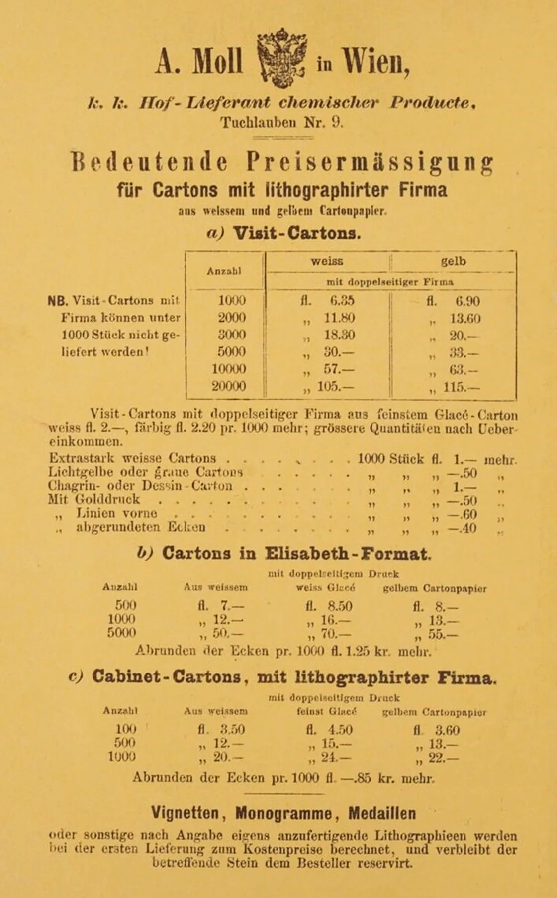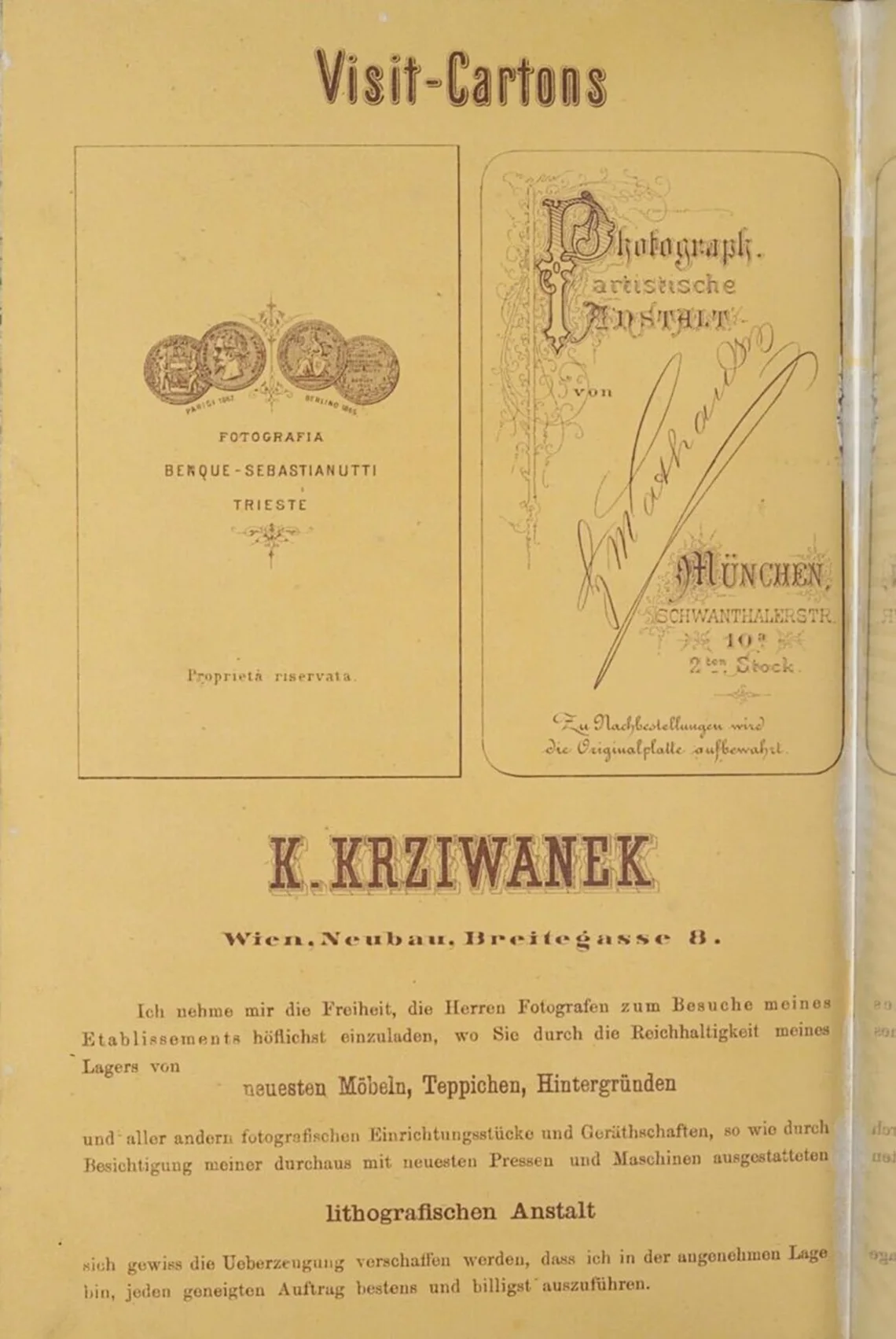 Der Stellenwert der Untersatzkartongestaltung spiegelt sich auch in Werbeschaltungen von auf Fotografen-Equipment spezialisierten Firmen wider, die in fotografischer Fachzeitschriften überliefert sind: so beispielsweise die Anzeige von Karl Krziwanek in der Zeitschrift „Photographische Correspondez“ von 1868, ebenda 1873 von A. Moll, der „Visit-Cartons“ in unterschiedlichen Farben und Stärken anbietet. In der doppelseitigen Anzeige der lithografischen Anstalt von Haufler & Schmutterer werden eine Vielzahl an „Muster[n] von eleganten Vignetten für Fotografie Cartons“ beworben („Photographische Correspondez“ von 1875).