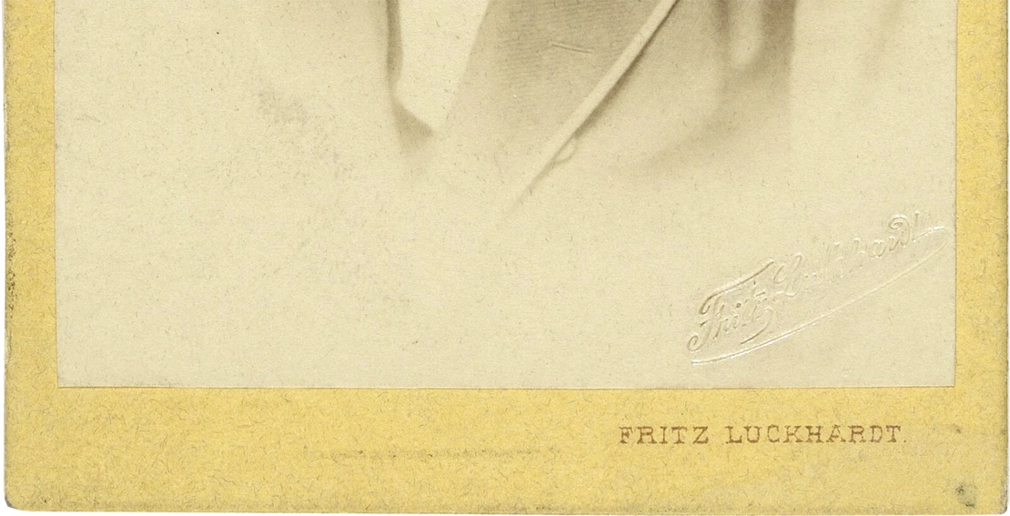 Sehr oft sind die Namen von Fotoateliers bzw. Fotograf:innen auf dem Untersatzkarton aufgedruckt, in der Regel auf der Rückseite (Revers), häufig aber auch auf der Vorderseite. Dort – auf dem Karton oder auf der Fotografie selbst – können sich zudem Prägestempel mit dem Namen des Fotografen befinden.