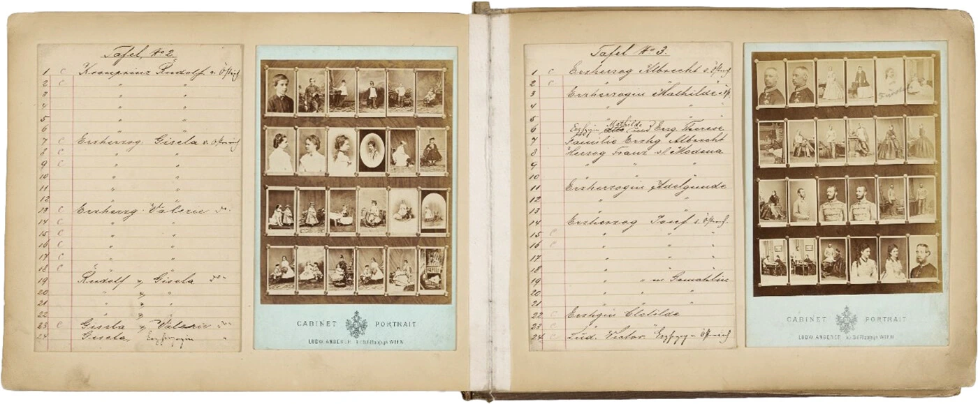 Diese – zum Teil signierten – Visitporträts wurden beliebte Sammelobjekte, die die Zeitgenoss:innen in eigens dafür produzierten Alben aufbewahren konnten. Auch Kaiserin Elisabeth folgte dieser Mode und sammelte Visitporträts, die sie in zahlreichen Alben zusammenstellte (vgl. Sisi privat. Die Fotoalben der Kaiserin – Museum Ludwig, Köln).