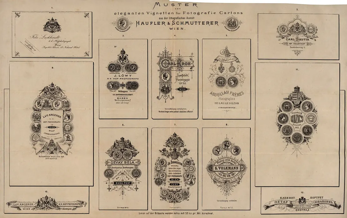 Ab der zweiten Hälfte der 1860er Jahre kamen Verzierungen etwa in Form von Allegorien, Utensilien des Fotografen oder Malers und ornamentalem Dekor in Mode (siehe Starl 2009, S. 44 f., Tabelle).
