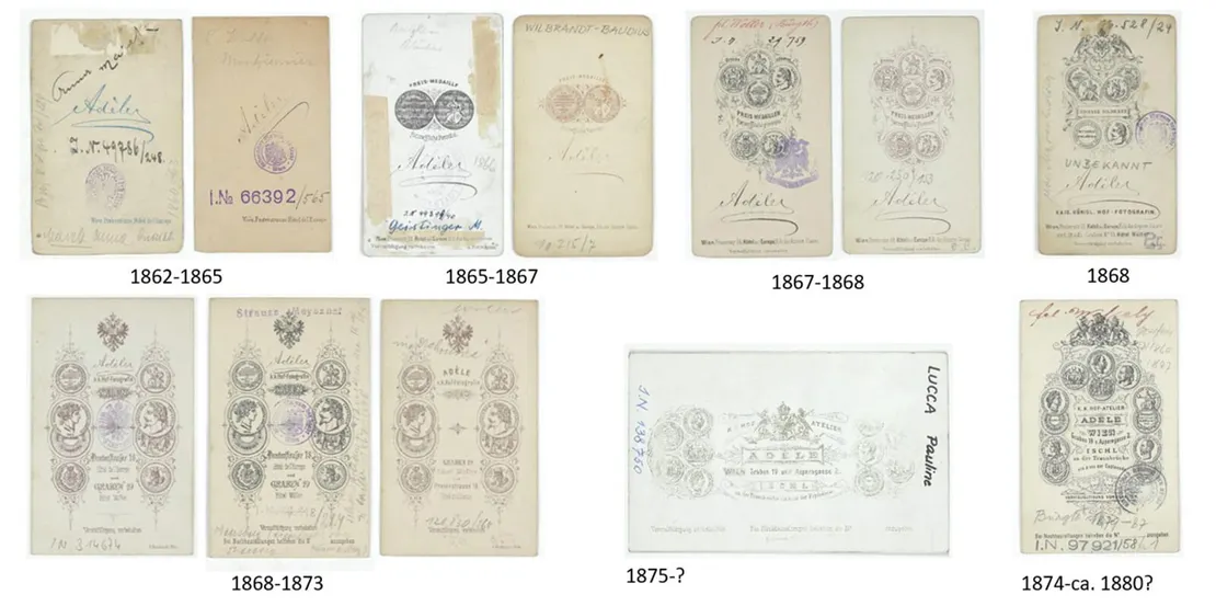 Genau diese Informationen sind wichtige Anhaltspunkte für die Datierung der Fotografien, da es sich bei dem Jahr der Verleihung der Medaille oder des Umzugs um den terminus ante quem bzw. terminus post quem handelt. Der Fotograf Fritz Luckhardt beispielsweise erhielt 1870 den Titel „k.k. Hoffotograf“, dementsprechend können Cartes de visite aus seinem Atelier mit der Nennung dieses Titels nicht vor 1870 entstanden sein. Umgekehrt müssen seine Fotografien ohne diesen Titel zwischen 1867 – dem Jahr der Ateliergründung – und 1870 datiert werden.