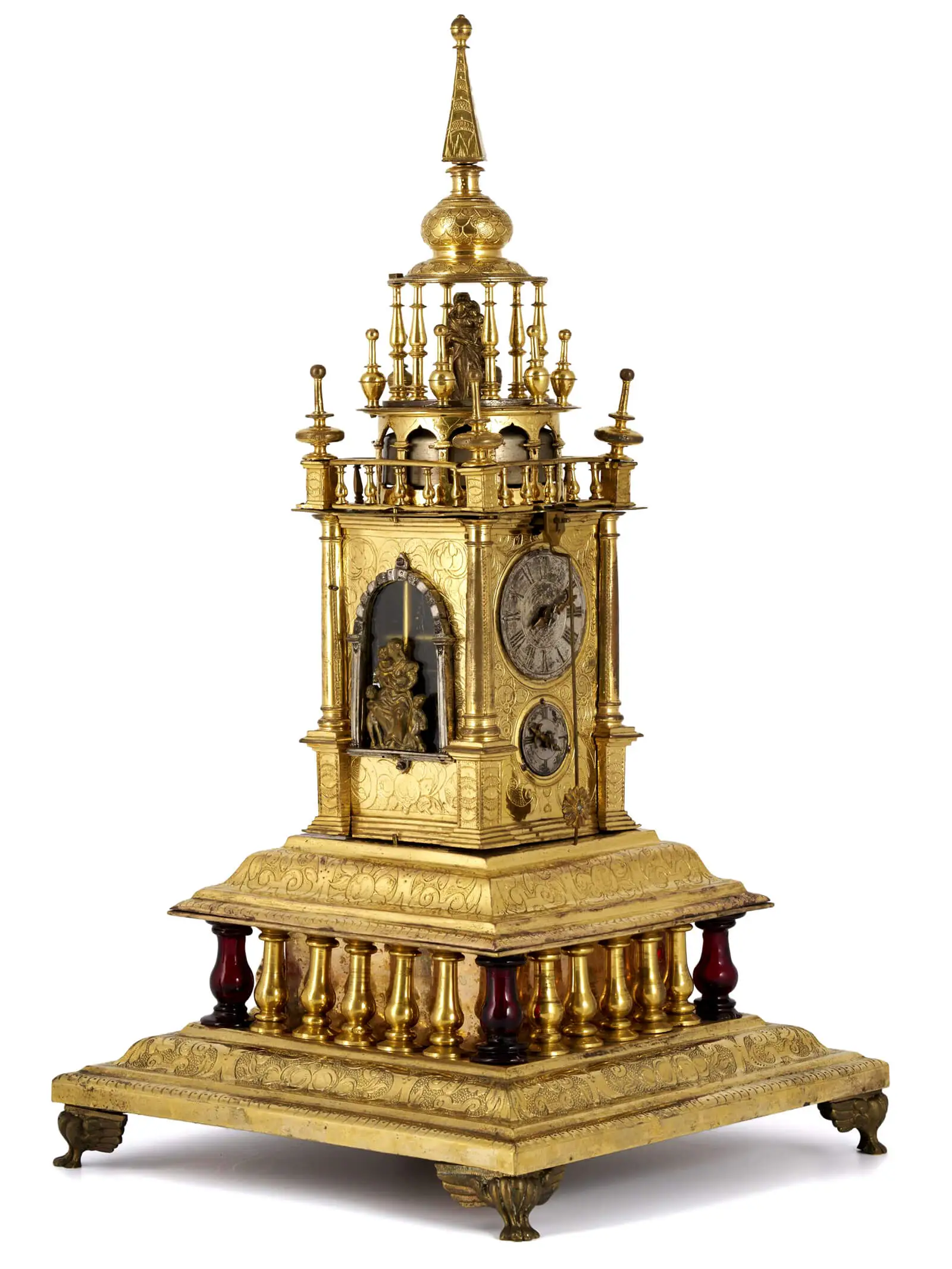 Beide Uhren wurden vom Wiener Uhrmacher Wenzel Schönberger hergestellt. Leider fehlen die notwendigen Konstruktionszeichnungen und –beschreibungen, um die häufige Behauptung zu bestätigen, dass es sich hierbei um die erste Fallblattzifferuhr handelte (mehr davon später). Schaut man sich jedoch die Fragmente dieses Systems an, scheint es unwahrscheinlich. Die großen schwarzen Bleche mit Ziffernausnehmungen weisen auf der Rückseite Halterungen für Glasscheiben auf, um die Beleuchtung von hinten zu ermöglichen. Wären die Ziffern wirklich gefallen, wäre da wohl jedes Mal das Glas gebrochen. Viel wahrscheinlicher erscheint ein Kettenantrieb, auf dem die Ziffern aufgefädelt waren und in die Ziffernausnehmung der Steinfassade geschoben wurden, oder eine Art Karussell, das sich wie die spätere Trommel horizontal drehte und eine nach der anderen Ziffer in das Sichtfenster transportierte.