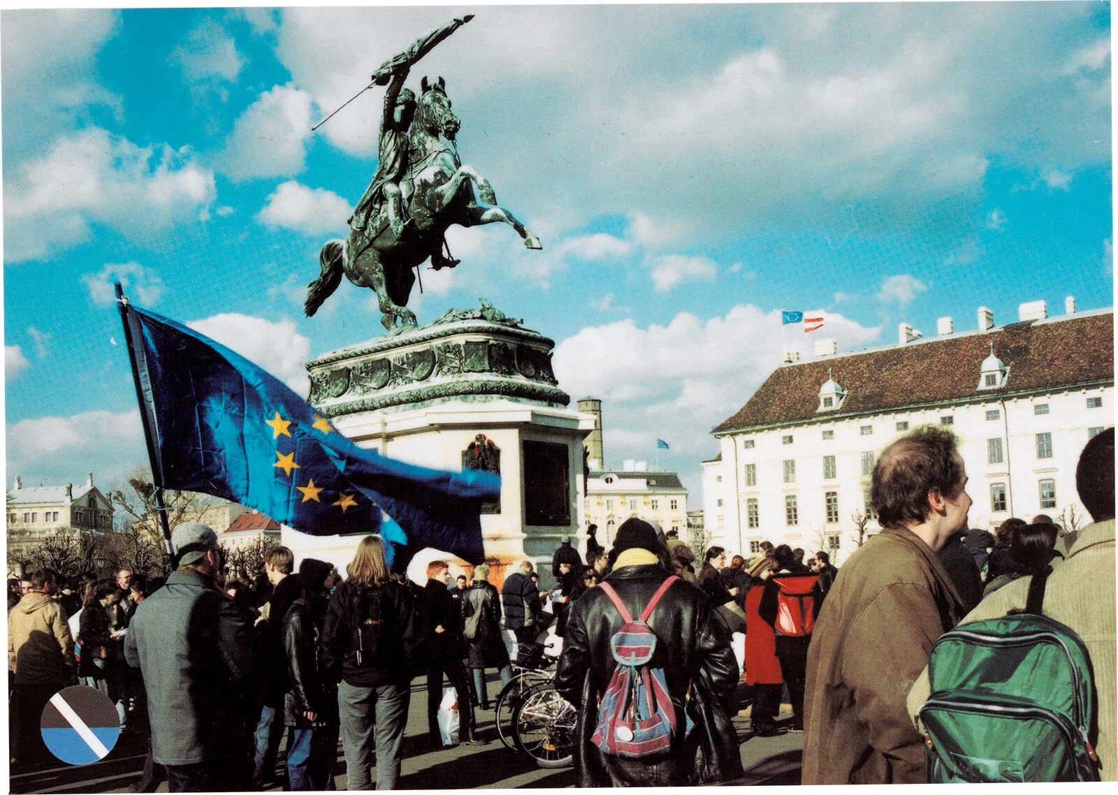 Heldenplatz, Samstagsdemonstration gegen Schwarz-Blau, aus der Serie: „Grüße aus Wien, Februar/März 2000“, Foto: Lisl Ponger, Verlag: Wieser, Klagenfurt, Wien Museum
