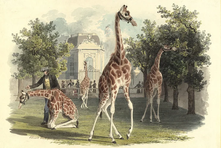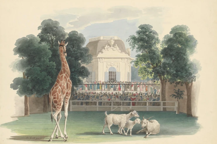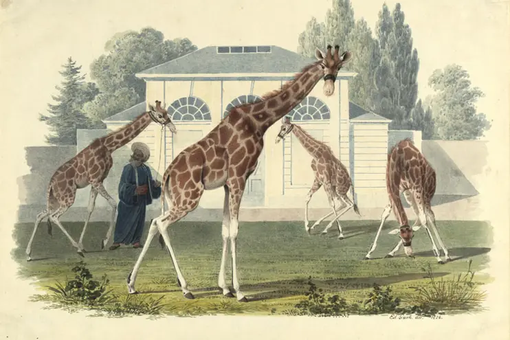 Am 6. August, einem Mittwoch, war die Kolonne schließlich da. Am selben Tage noch gönnte sich des Kaisers Hofstaat das außergewöhnliche Vergnügen, das bizarre Tier in Augenschein zu nehmen. Nachmittags, beliebte die Hauptstadtpresse am nächsten Tage zu kolportieren, geruhten Ihre Majestät die Frau Erzherzogin Marie Louise nebst Sr Durchlaucht dem Herrn Herzoge von Reichstadt, Dann Sr k. k. Hoheit der Herr Erzherzog Carl mit höchstseiner durchlauchtigen Familie, und Ihre k. k. Hoheiten die Herren Erzherzoge Anton und Ludwig dieselbe zu besichtigen. Es wurde ein Gehege gebaut. Und eine „Giraffenloge“ errichtet. Und wie in Paris brach sich Giraffomanie Bahn.